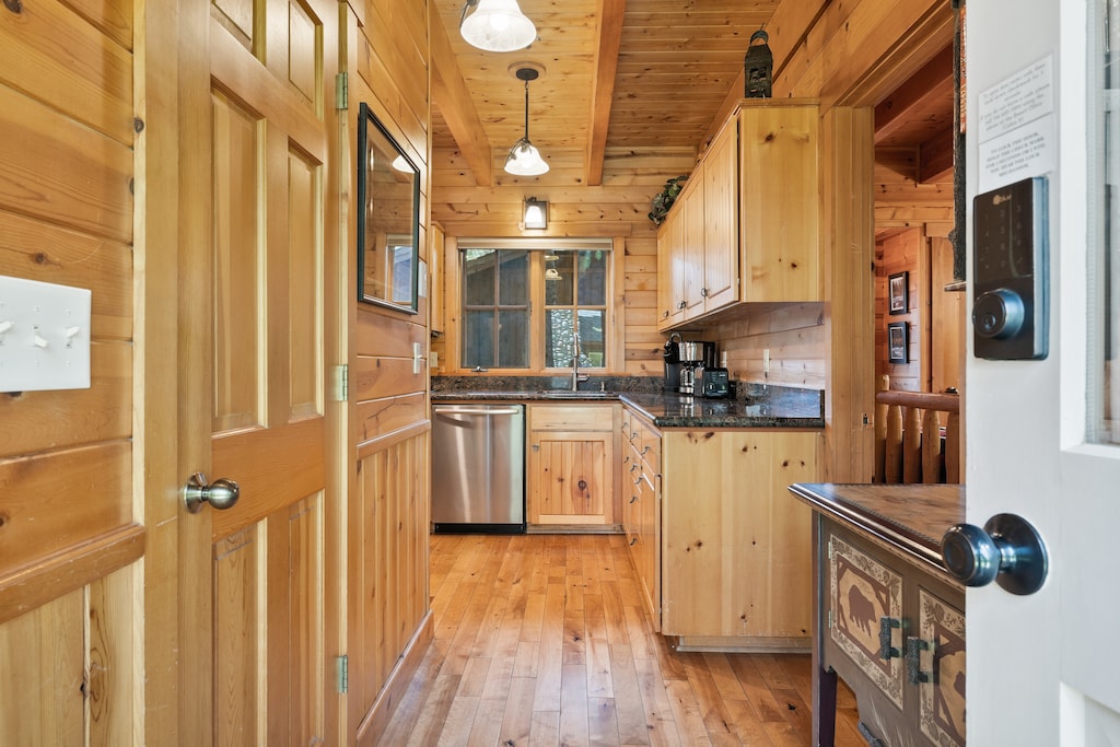 Enjoy the river view over breakfast or while preparing an intimate meal in the fully equipped kitchen. Slab granite countertops and stainless appliances bring an unexpected level of sophistication for your cabin experience while the graceful river setting provides the ultimate getaway.