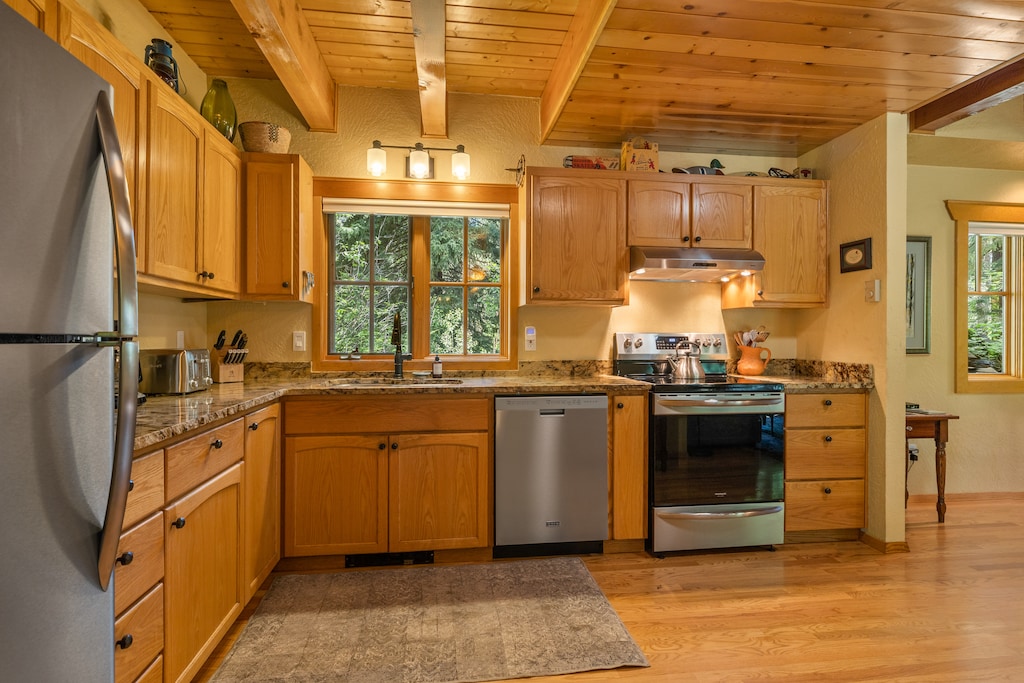 Inside, rustic details combine with modern amenities for a comfortable stay. Cozy up on chilly nights next to the wood-burning fireplace, complete with a river rock surround. Watch a show together on the flatscreen cable TV, or hop on the free WiFi to post your latest vacation photos. There’s a fully equipped kitchen for all your cooking needs, including stainless steel appliances, a dishwasher, and granite countertops.