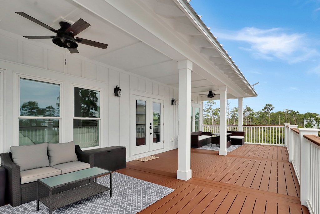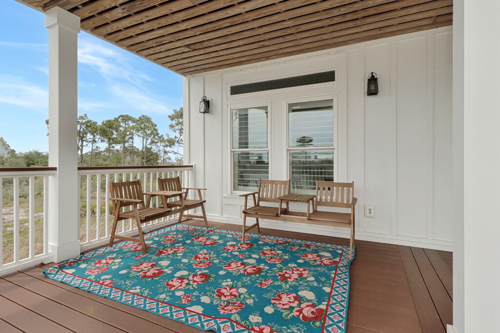 Home Away from Home is a spacious 4-bedroom, 3-bath coastal retreat nestled in the gated beachside community of WindMark. Grand in both size and charm, this beautiful home welcomes you with a sweeping front staircase, a covered front porch with ceiling fans, and plenty of comfortable seating to enjoy the ocean breeze. Inside, you’ll find custom bunk rooms perfect for families, joined by a Jack and Jill bathroom with double vanities and both a tub/shower combo and a separate glass shower. Two luxurious master suites—one on each floor—feature king beds and spa-style bathrooms, including a stunning glass-walled shower room with dual shower heads and a soaking tub.