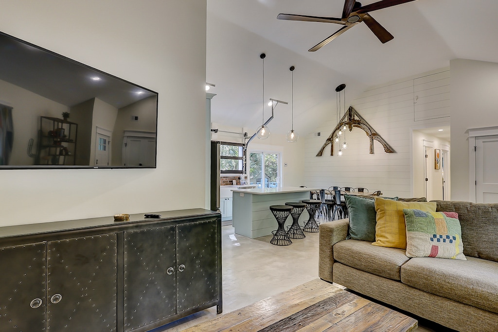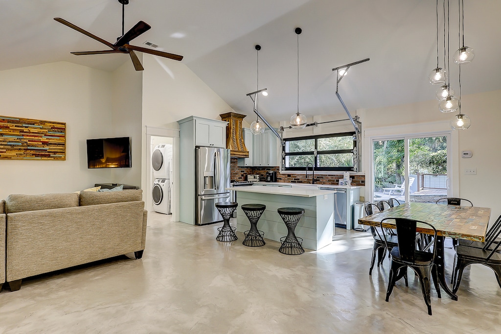 Step inside to a spacious open-concept layout where everyone can gather with ease. The cozy living area features a plush sectional sofa and large Smart TV—ideal for movie nights or unwinding after a day in the sun. The adjacent dining space seats 8 comfortably, with room for 3 more at the sleek kitchen island.