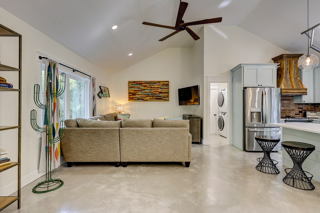 The fully equipped gourmet kitchen is a chef’s dream, featuring stainless steel appliances, ample counter and cabinet space, and a Keurig coffee maker to start your mornings off right. The kitchen also has garage-style windows that open to the backyard!