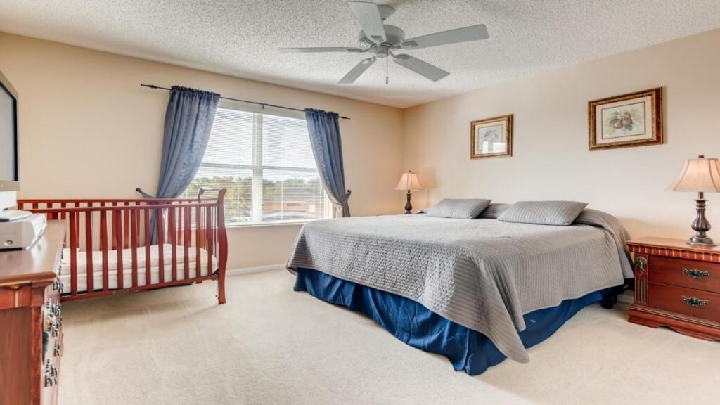\- 1 King Bed with Flat Screen TV, Ceiling Fan, Crib, Adjacent Hallway