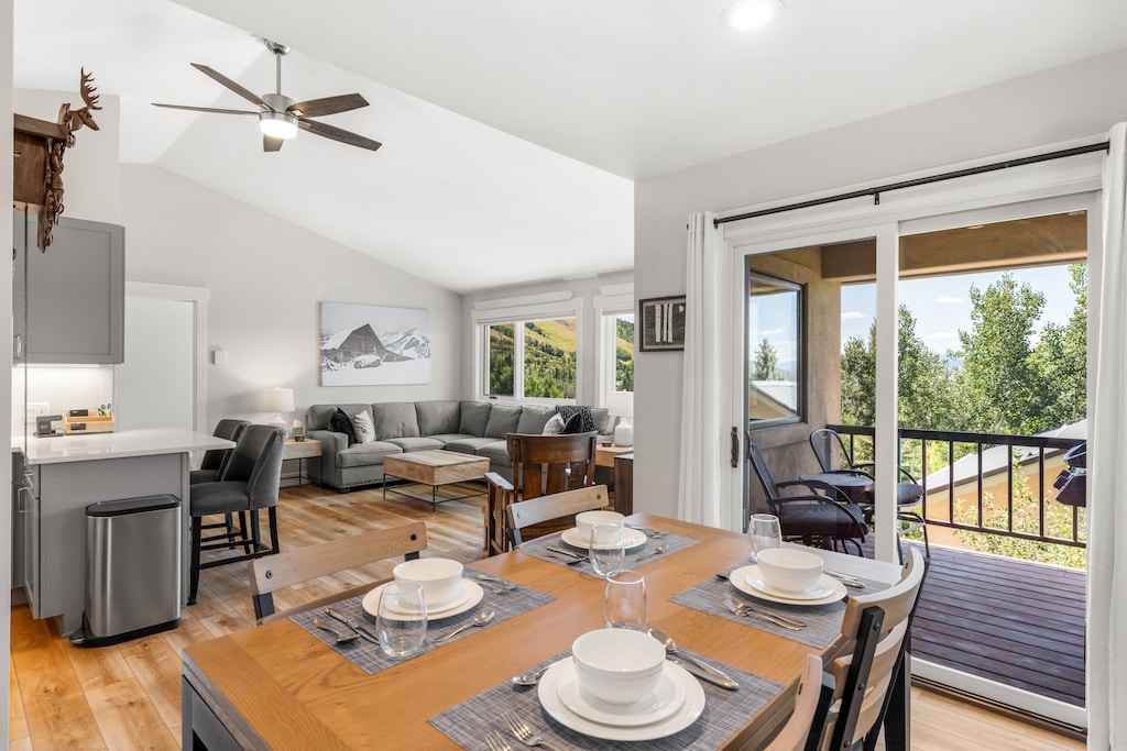 Step inside to find a bright and airy living area with vaulted ceilings, hardwood floors, and expansive windows that frame panoramic views of the Steamboat Ski Resort and Yampa Valley. The open floor plan connects seamlessly to the dining area and fully renovated kitchen, which features quartz countertops, stainless steel appliances, and custom cabinetry.