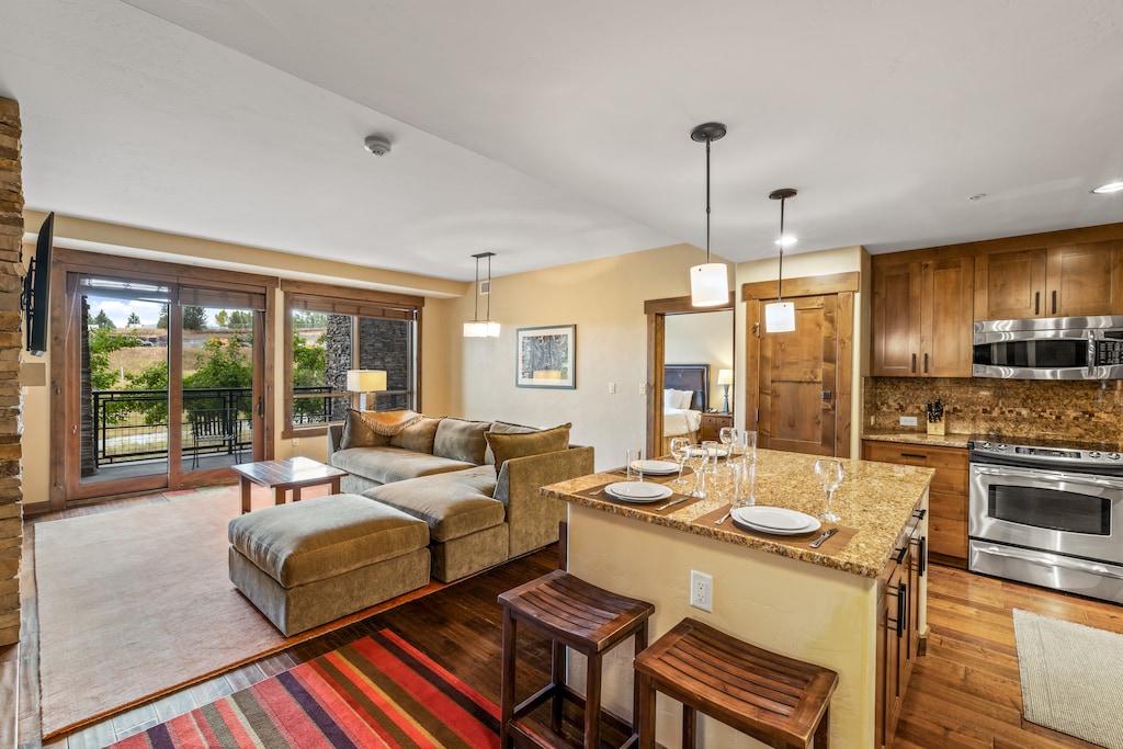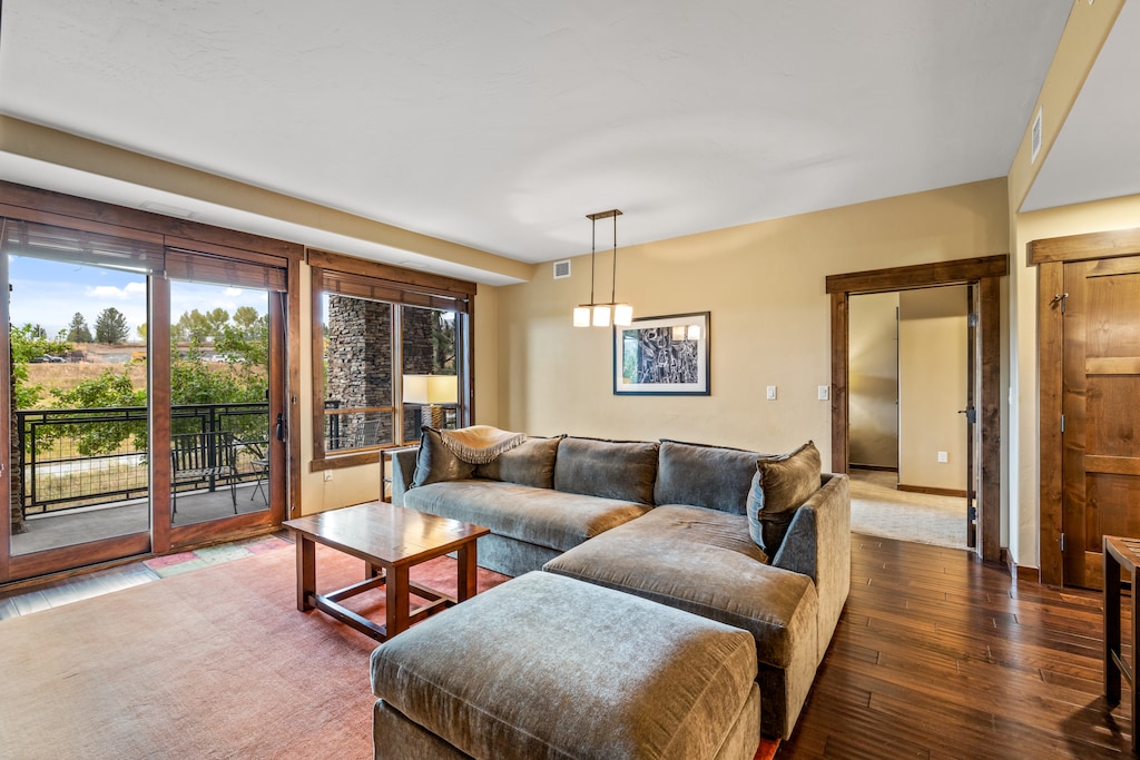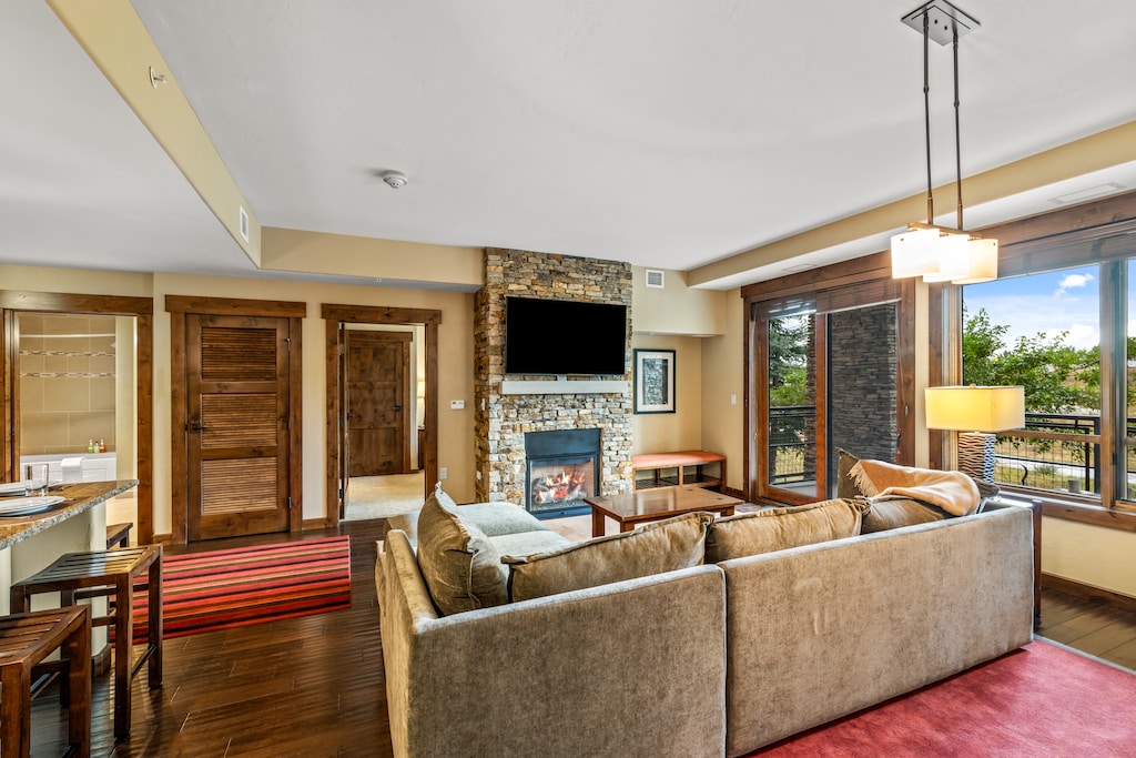 The open living space is designed for comfort, featuring a plush sectional sofa, a stone fireplace with mounted flat-screen TV, and expansive windows that lead out to a private balcony. Rich hardwood floors and natural finishes create a warm mountain vibe throughout.