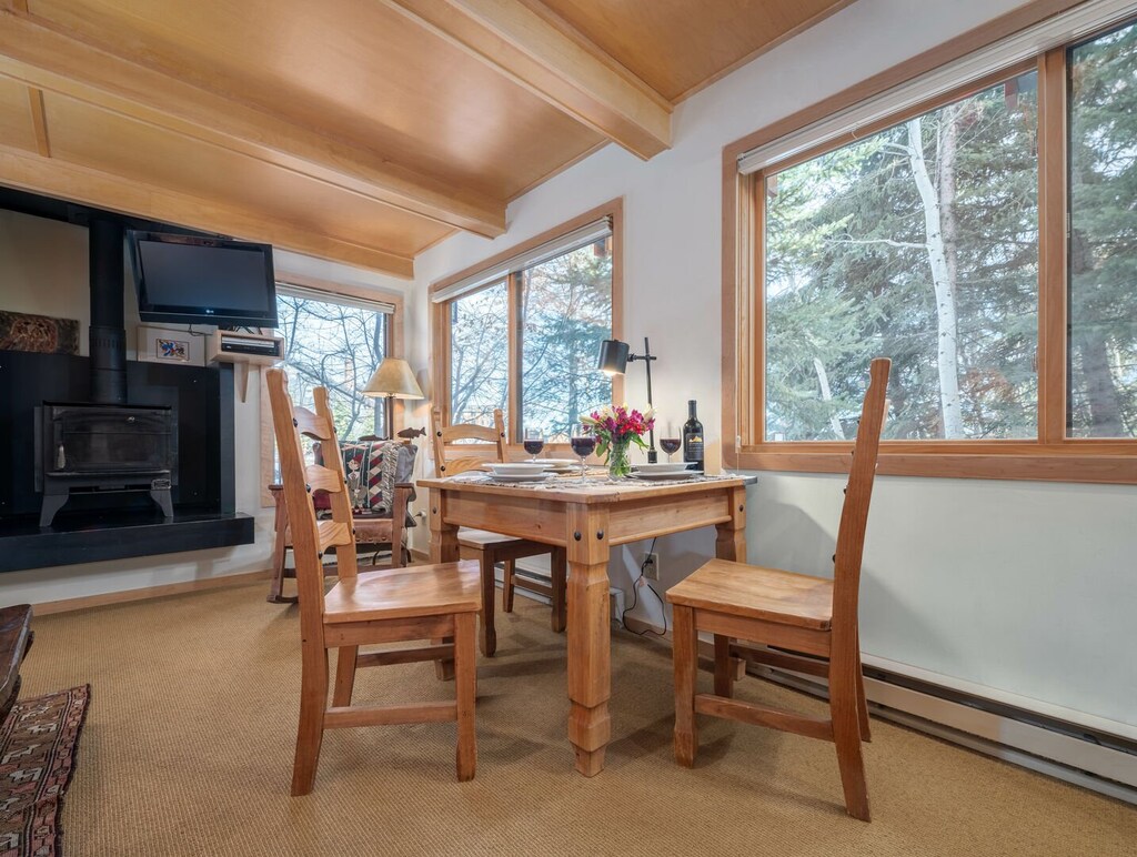 Location, location, location! Within easy walking distance to all the shops and restaurants in Teton Village as well as the Tram and Gondolas. This cozy, ground floor condo offers a small queen bedroom with TV and a surround cupboard for storage plus a full attached bath. You’ll enjoy a fully equipped kitchen with stainless steel appliances and a granite top breakfast bar. The living room includes a queen sofa sleeper, TV, a small dining table and additional clothing storage dresser. A community washer/dryer is available in the building. You need to walk pass unit #2 and to the right there is a closet door with a keypad that requires a code to enter in. These properties have a small wood stove making them very cozy.
