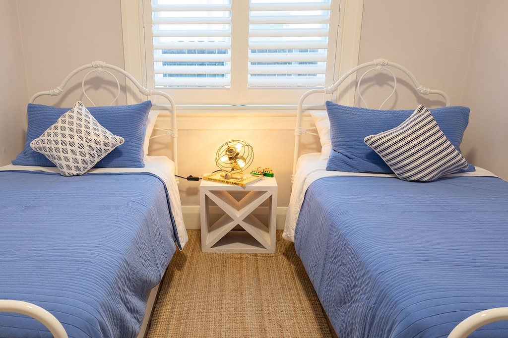 Step inside and watch the open plan living and dining space welcomes you with pale timber floors and white walls that amplify the natural light. Botanical print armchairs frame a glass topped coffee table, while a round dining table for four sits beneath a white brick fireplace feature. The modern kitchen flows seamlessly from this space, designed with white cabinetry, marble benchtops and quality appliances, perfect for everyday cooking sessions. When sleep calls, the first bedroom offers a serene retreat, with a queen bed dressed in white linens, while the second features two single beds, ideal for children or visitors. A contemporary bathroom services both rooms, while the dedicated workspace ensures you can stay productive. Split system air conditioning and heating keep the apartment comfortable year round and a washing machine elevates daily convenience.