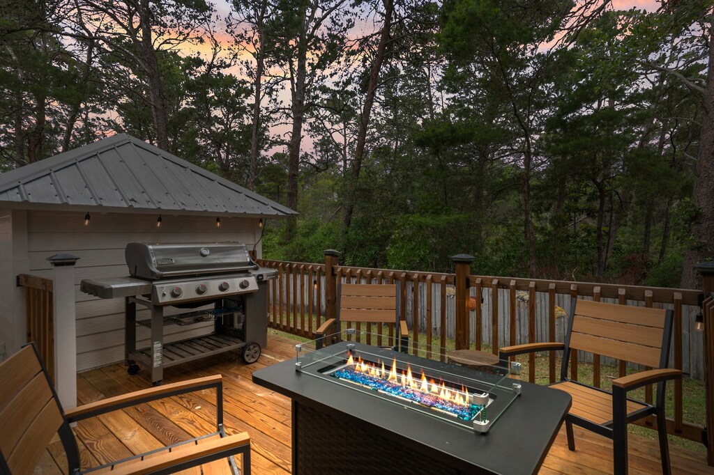 Neutral colors and modern finishes curate a peaceful environment inside this charming 2-level home. Guests enter into the open living space, where 2 soft couches, a plush armchair, and 65” TV invite leisurely evenings with the group. A few steps away, a wood dining table with 6 wicker chairs brings beachside charm to formal meals, with extra seating for 4 at the nearby breakfast bar. The kitchen is fully equipped with high-end appliances, including an induction stove, and there’s a grill on the back porch for barbecue lovers. After nightfall, be sure to light up the gas firepit for late-night cocktails or roasting s’mores! When it’s time for bed, guests will find 1 guest bedroom on this level with a king bed, Smart TV, private bathroom, and back porch access. A washer and dryer by the kitchen add convenience for extended stays.