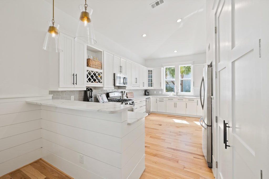 Bungalow. Stepping inside, guests discover elegant coastal interiors with white shiplap