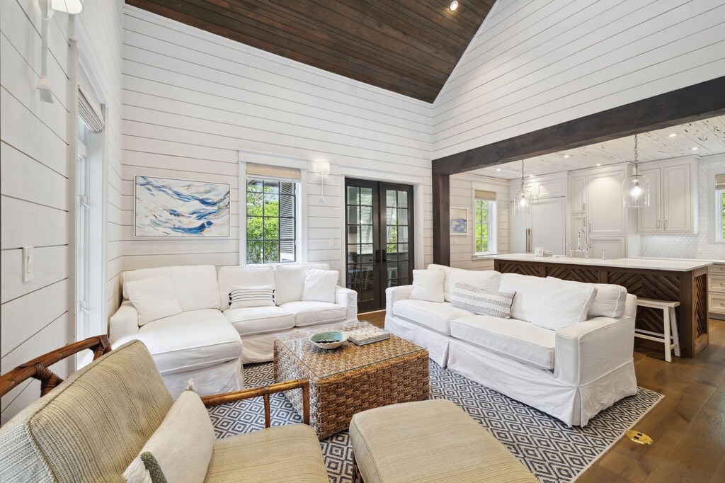 On the second floor, a soaring vaulted ceiling heightens the brightness an open kitchen and living area. A loveseat, chaise sofa, and chairs surround a 65” TV in the living area. Premium Thermador appliances, a 6-burner gas range, a pecky cypress ceiling, and custom cabinetry transform the glistening kitchen into an extension of the living area. A dine-in island overlooks French doors that open to a shaded side porch. A beautiful dining room is tucked beside the living area. 2 separate dining tables have bench and chair seating and seat 10. A wall of windows lets light pour in, and 2 doors on either side of the dining room open to 2 individual porches. Off the living area is a primary bedroom with incredible woodwork. A low 4-poster king bed, white shiplap walls, a darker accent wall, pecky cypress doors, and a private bathroom with a shower are a quiet retreat.