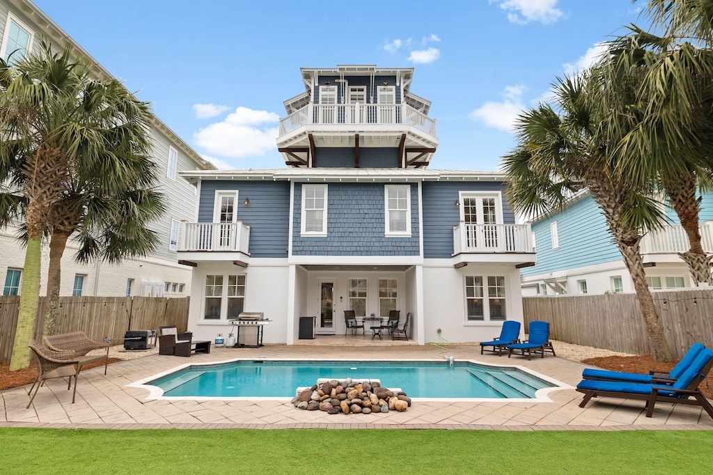 DETAILS: Escape to Casa Bella, a stunning Gulf-view retreat in peaceful Seacrest Beach along Scenic 30A. This spacious 5-bedroom, 3-bathroom with 2 half-baths haven sleeps up to 18 guests, offering the perfect getaway for friends and family. With 3,500 square feet of living space, guests will love the air hockey table, pristine private pool, and wraparound rooftop balcony with 360-degree views of the Gulf—all within steps of beach access, located directly across the street.