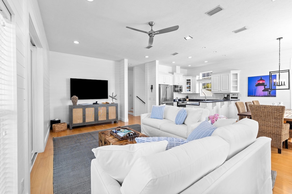 The second floor is the heart of this professionally furnished and decorated home, characterized by white shiplap walls and hardwood flooring in the spacious open floor plan. Gather with friends and family in the welcoming living area, where 2 comfortable slipcovered couches and a large 70” TV invite guests to unwind. Delight in the well-equipped kitchen with new high-end appliances, including a 4-burner electric oven and Bosch refrigerator, complemented by granite countertops. Savor meals in the traditional dining area with rattan seating for 7, surrounded by scenic neighborhood views. Experience the calming sounds of the Gulf on the screened-in porch overlooking the pool, featuring a 6-person dining table, outdoor couch, and direct pool access from a gated stairway. The vibrant guest bedroom offers a cozy retreat with a plush queen bed, 43” TV, and direct balcony access. A new washer and dryer adds convenience.