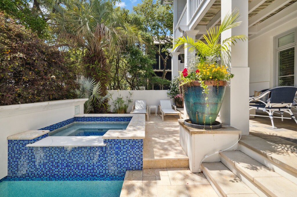 DETAILS: Located south of 30A, Blue Door Cottage is a beautifully renovated 4-bedroom, 4.5-bathroom property in Rosemary Beach that sleeps 12. Steps from private beach access, an adjacent boardwalk leads to the sandy shores, Coquina pool, and the Rosemary Beach shops and eateries. Enjoy the private pool and professionally decorated interiors—boasting new furnishings, light fixtures, refinished hardwood floors, and fresh paint!