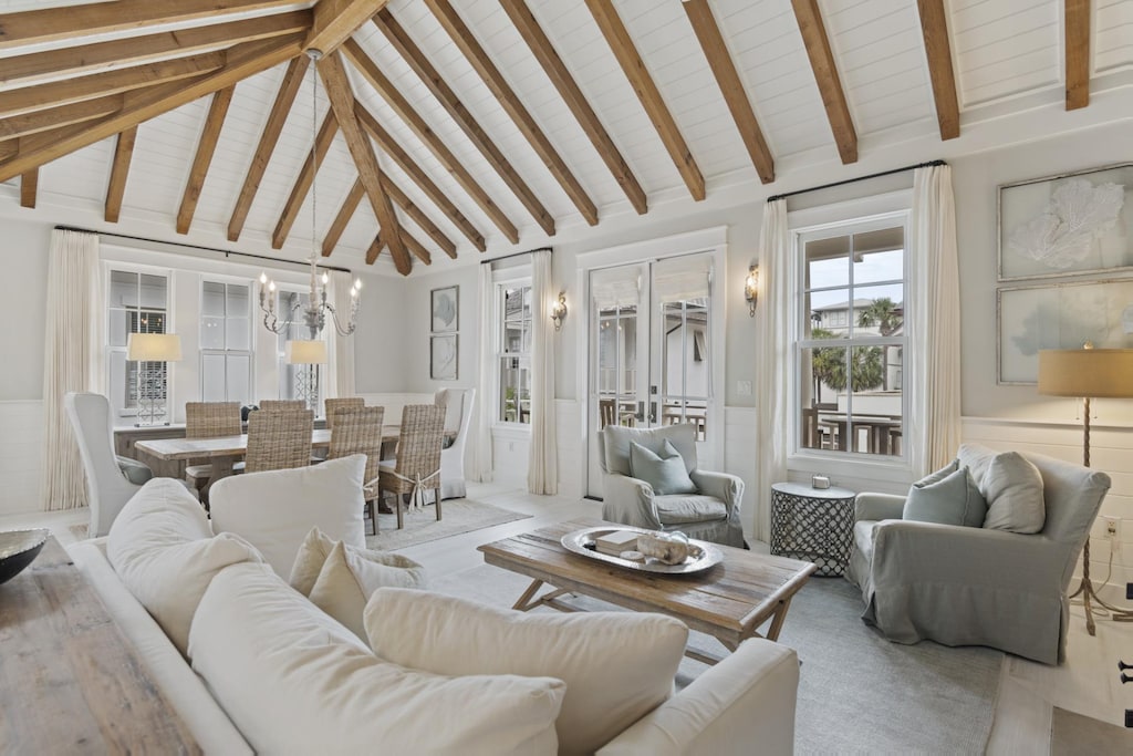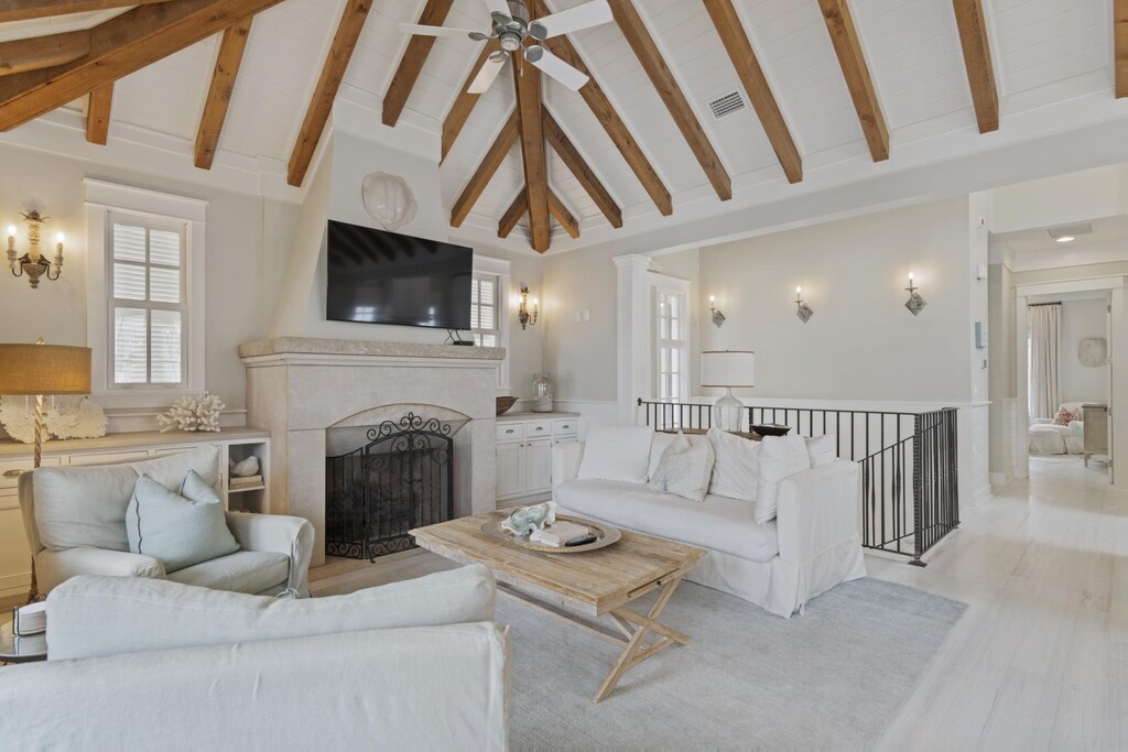 Dramatic exposed ceiling beams on the second floor pull the eye up to the beautiful arched ceilings. An open kitchen, dining, and living space enjoy lots of natural light and open to a balcony with views of Rosemary Beach. A sofa and comfy armchairs surround a dramatic fireplace in a living area dotted with seashells and coastal accents. Premium appliances, marble countertops, and a center island that seats 4 complete a beautiful chef’s kitchen. A dining table seats 8. Tucked behind the kitchen is a guest bedroom with a king bed and a private bathroom with a shower/tub combo. A smaller den gives guests a private area to relax on a wrap-around sofa, play games, or enjoy a movie.