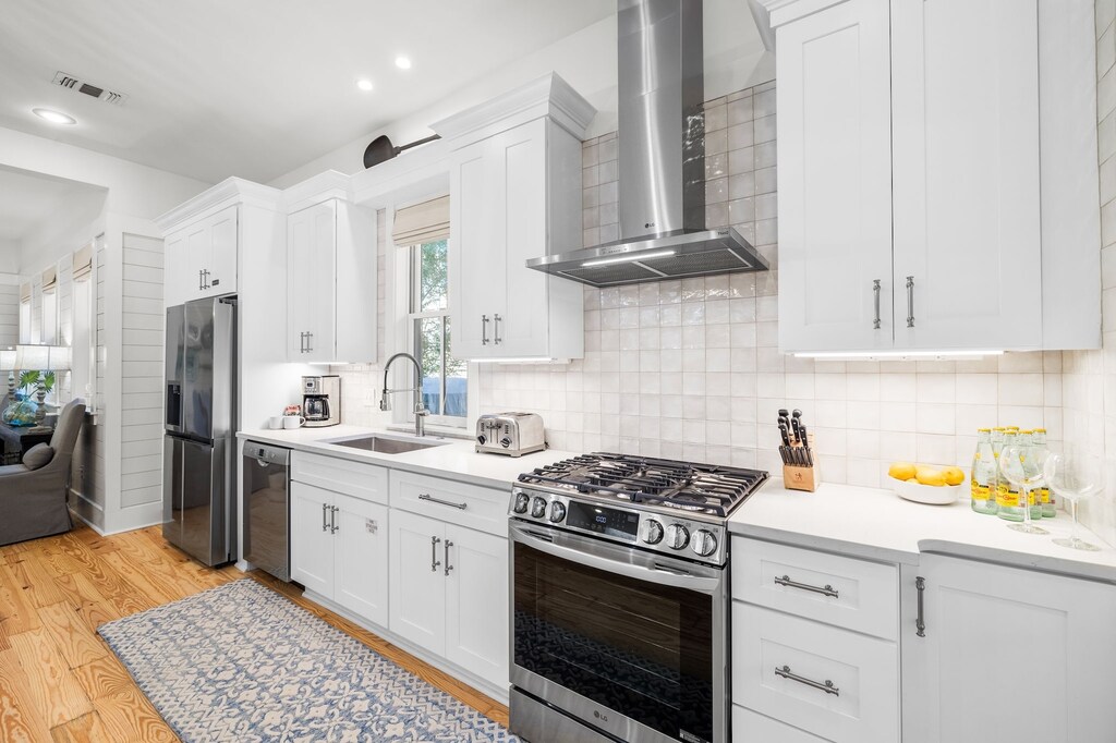 The first floor is the home’s main floor, which encompasses an open living and kitchen area. The kitchen has premium finishes such as stainless-steel appliances and sparkling white backsplash and countertops. There is seating for 14 at both the breakfast bar and dining table. The living area has plenty of seating surrounding the flat-screen TV and opens up to the screened porch. The porch acts as an additional living area when guests want to enjoy the outdoors, featuring an outdoor fireplace, flat-screen TV, and separate dining area with seating for 12 at the custom-built farm table. There is also a grill for guests to enjoy preparing a fresh meal while enjoying the home’s private pool. The first floor also has a half-bathroom and full laundry room down the hall off of the kitchen.