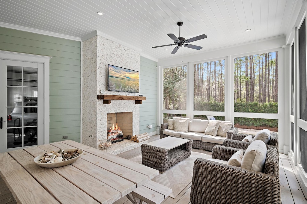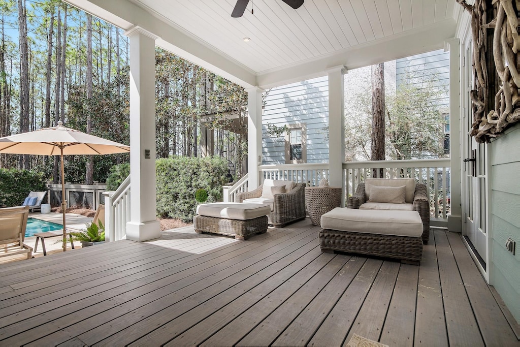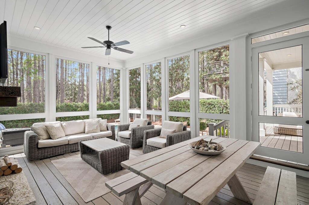 Designed by the renowned architects of Caldwell-Cline, this lovely home welcomes guests with a wide porch bedecked with padded wicker furniture and an overhead fan. Inside, reclaimed heart pine floors, shiplap walls, and cypress-beamed ceilings add understated elegance to the comfortable living space, furnished with 2 plush white couches, matching armchairs, a 65” Smart TV, and Sonos soundbar. The airy kitchen seamlessly connects to the living area and features custom cabinetry and Thermador appliances. Continue into the dining alcove with a pale wood round table that seats 6. This level has 1 guest bedroom with a king bed and private bathroom. A screened porch with woven furniture and a picnic table begs guests to unwind with a tart glass of lemonade on a breezy afternoon. The yard backs up to a stunning nature preserve, providing a secluded oasis to enjoy the covered veranda, crystalline pool, and sitting spa.