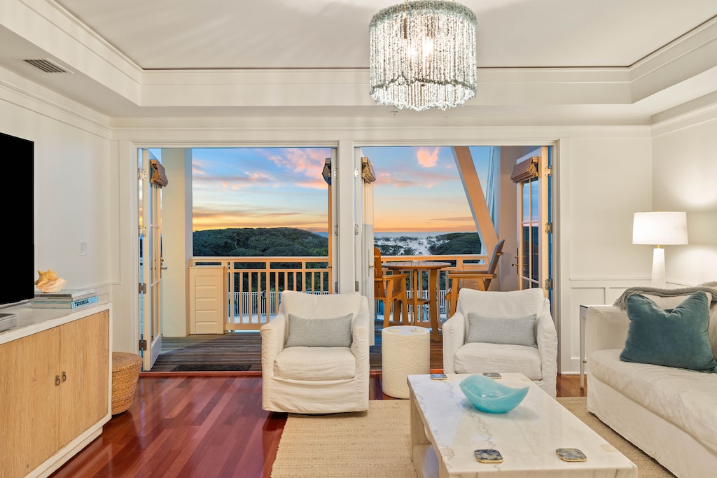 The views only improve on the second floor! Guests can see native dunes and sparkling blue Gulf waters from an open kitchen, dining, and living area with hardwood floors. An additional entry behind the kitchen opens to a covered walkway accessible by stairs or elevator. A newly furnished guest bedroom with a king bed and a shared newly renovated bathroom with a shower also has separate access to the walkway. The beautifully renovated and inviting kitchen has premium stainless-steel appliances, a farmhouse sink, marble countertops, and a breakfast bar looking out onto a new dining table with seating for 6. Local artwork depicting Western Lake and soothing shades of white and gray create a calming environment for family and friends in the living area. The second floor living room offers a 75’’ Smart TV facing a comfortable sofa, and four new armchairs with clean, modern lines. French doors open to a spacious balcony with outdoor dining tables and chairs where guests can celebrate sunset and enjoy dinner under the stars. A primary bedroom off the living area has a sleek modern king bed, two comfortable armchairs, a private bathroom with a soaking tub, a separate shower, and access to the balcony.