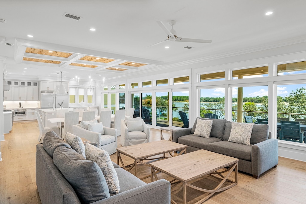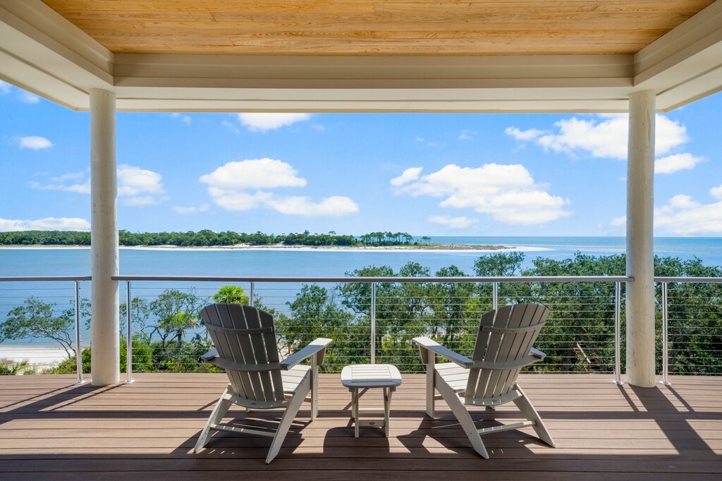 The elegant great room resides on the third level, featuring a wall of windows that spans the room and offers breathtaking views of the shimmering water and picturesque St. Vincent Island. The designer kitchen is a chef’s delight with a Wolf gas stove, wine cooler, and an expansive island that doubles as a breakfast bar for 6. A 10-seat dining table beneath a coffered ceiling separates the kitchen from the living space, which boasts a mix of soft seating, an 86” Smart TV, and a gas fireplace. On the balcony, multiple Adirondack chairs and 2 patio tables invite alfresco meals and tranquil evenings watching the sunset. When it’s time to retire, guests will find 1 guest bedroom with a king bed and private bathroom on this level.