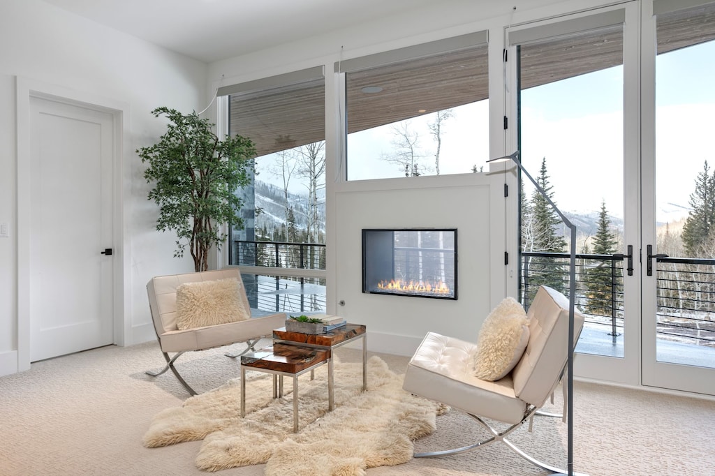 Tranquility meets elegance in this incredible 2-story retreat, where the top floor is the heart of the home. With stunning décor that evokes peace, as well as pops of blue that are reminiscent of the Park City sky, and a wall of windows that frame the picturesque mountain views, this great room has it all. The living area is luxurious and inviting, boasting stylish furniture and a TV with Sonos speakers. Separating the living and dining areas is a fireplace that adds to the coziness of the space. The dining area is elegant, seating 8 on plush chairs adjacent to a second fireplace encased in marble. The gourmet kitchen is equipped with high-end appliances, spacious countertops, and a 4-stool breakfast bar. Relax in the TV room on the comfortable couch before retiring to the 4 bedrooms on this floor—3 bedrooms with king beds and 1 other with a queen bed—all with private bathrooms. Experience seamless indoor-outdoor living with easy access to the furnished deck from every corner of the spacious great room on this floor.