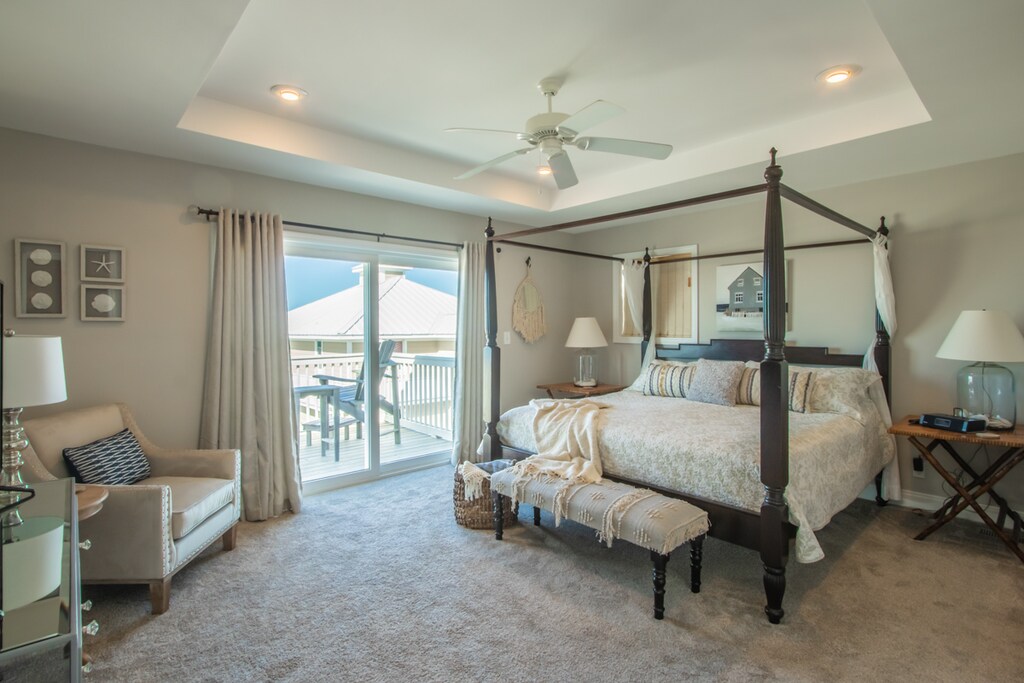 The primary bedroom is located on the 4th floor of the home. It features a king-sized bed, a flatscreen Smart TV, and access to a deck with spectacular water views, as well as outdoor seating. There is also an en-suite bathroom with a walk-in shower.