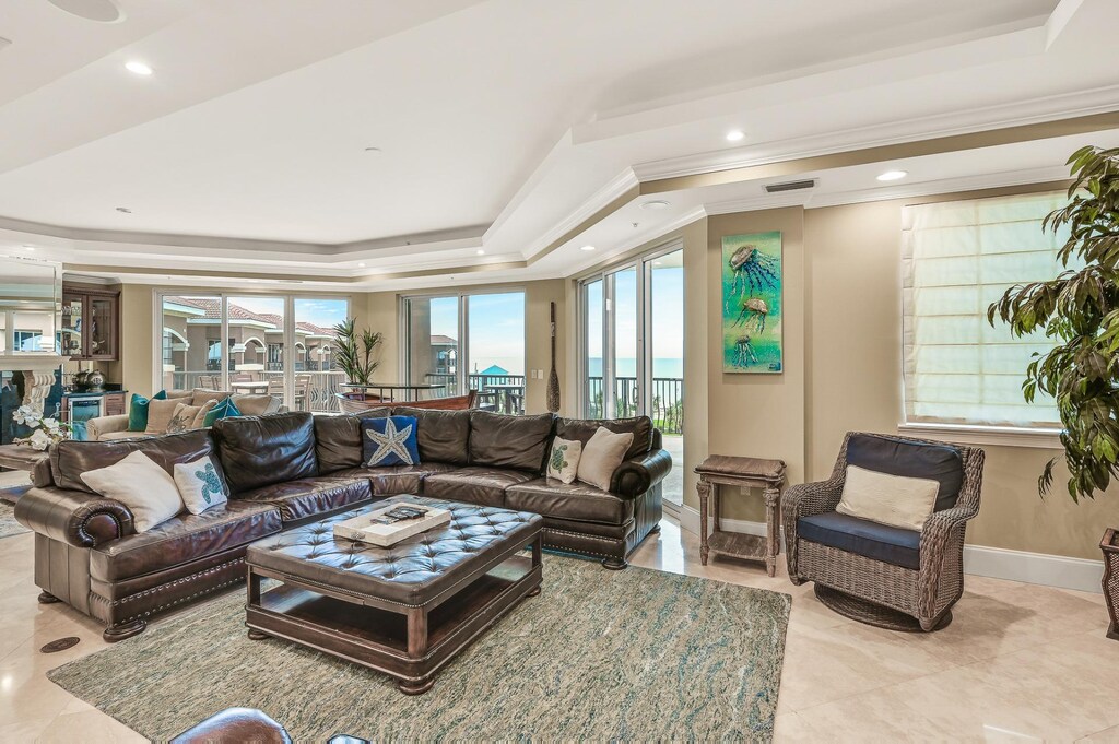 DETAILS: "Mediterranea Penthouse" is a breathtaking, newly remodeled luxury penthouse at Mediterranea of Destin. Boasting an impressive 3,300 square feet indoors and 1,700 square feet of patio space, there is a total of 5,000 square feet of luxurious indoor/outdoor accommodations! Occupying the entire fifth floor of the main building, this incredible penthouse offers unobstructed Gulf views from nearly every room! The open-concept Great Room features a wet bar with a wine fridge, a stand-alone boat bar, multiple seating areas, a 70-inch Smart TV, and a top-of-the-line entertainment system. An entertainer’s delight, the gourmet kitchen is fully stocked and remodeled with high-end appliances. Enjoy dinner at the spacious 10-person dining table with the Gulf as a beautiful backdrop! Make your way to the Gulf-facing balcony for an unheard-of 1700 square feet of outdoor entertaining space, running the full length of the condo. Outfitted with dining tables and four chaise lounges, enjoy a meal al fresco or take in one of our famous Gulf Coast sunsets!