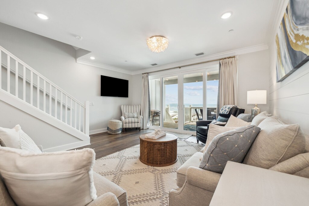 Wicker accents, shiplap walls, and a palette of cool gray create the feeling of a coastal cottage inside this 3-story hideaway. Guests enter the first level beside the kitchen, which is fully equipped with Café GE appliances and beautiful granite countertops. A breakfast bar with seating for 2 opens the kitchen to the dining space, where a 4-person dining table awaits delicious meals. After a day in the sun, relax on the living space’s soft couch, loveseat, and 2 armchairs to stream entertainment on the 65” Smart TV. The covered patio hosts an outdoor table for 6 with sweeping views of the Gulf and steps to the dedicated beach access for effortless beach days.