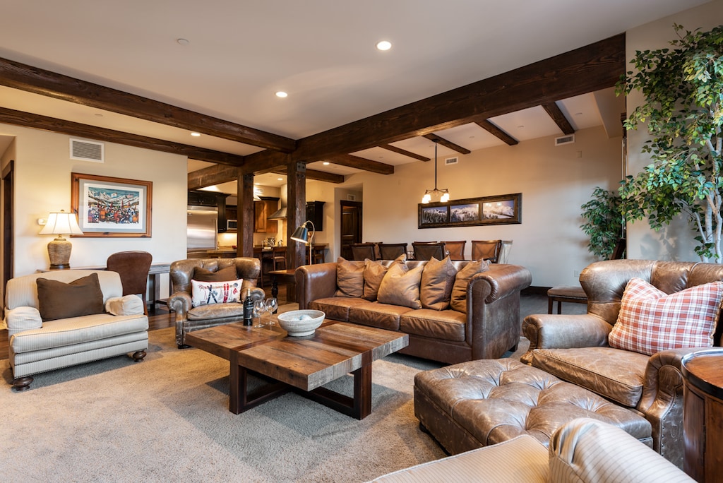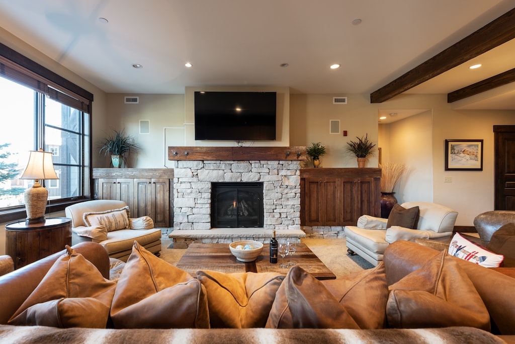 Step inside this beautiful alpine condo, offering an inviting retreat filled with luxurious amenities and thoughtful design. The living area features a stacked stone fireplace with a TV mounted overhead and large picture windows that bathe the space in natural light. Comfortable furnishings provide ample seating for unwinding with a glass of wine or gathering around the fireplace. Dinnertime is a delightful affair at the 8-person traditional dining table, perfect for planning tomorrow’s adventures or enjoying family game nights. The 4-stool breakfast bar offers a convenient spot to fuel up before catching first tracks in the morning. A gourmet kitchen boasts high-end Viking appliances, dark wood cabinetry, and granite countertops, equipped with all home necessities, including a Keurig coffee maker and blender. Convenience is further enhanced by the washer and dryer. When it’s time to retire, unwind in the spacious primary bedroom featuring a king bed and private bathroom with a jetted soaking tub, or choose from the 2 additional guest bedrooms, one with a king-sized bed and the other with a queen, both boasting TVs and private bathrooms. On bluebird days, the private hot tub on the balcony, complemented by a BBQ grill and patio seating, creates an ideal setting for soaking in the natural splendor and unwinding in luxury.