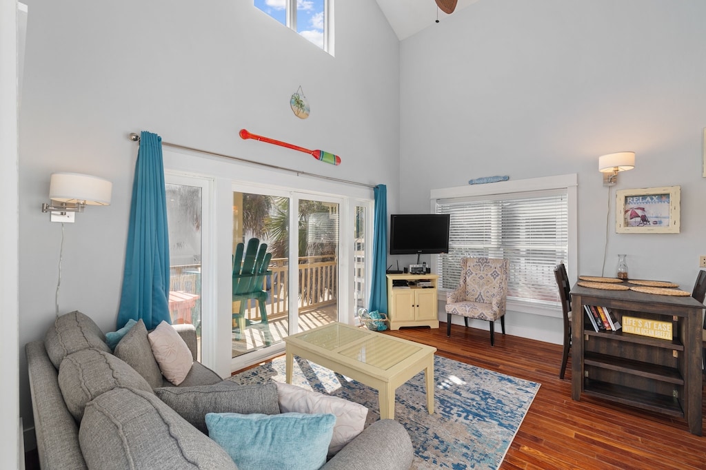 The home’s entrance is on the second level, where guests will discover an open-concept living area with high ceilings. The kitchen features high-end appliances, granite countertops, and designer cabinets. The dining area has table seating for 4, with additional seating for 2 at the breakfast bar. Sink into the living area’s soft sofa for a relaxed vacation movie night or wander onto the deck showcasing Gulf views. The Adirondack chairs are perfect for enjoying morning coffee and an evening glass of wine alongside the soothing ocean soundtrack. Take the exterior spiral staircase to the upper deck—accessible only from the outdoors—for even more spectacular views. At bedtime, retire to the guest bedroom tucked behind the kitchen featuring a queen bed, private bathroom, and Roku-equipped TV. A queen sleeper sofa in the living space offers additional sleeping accommodations.