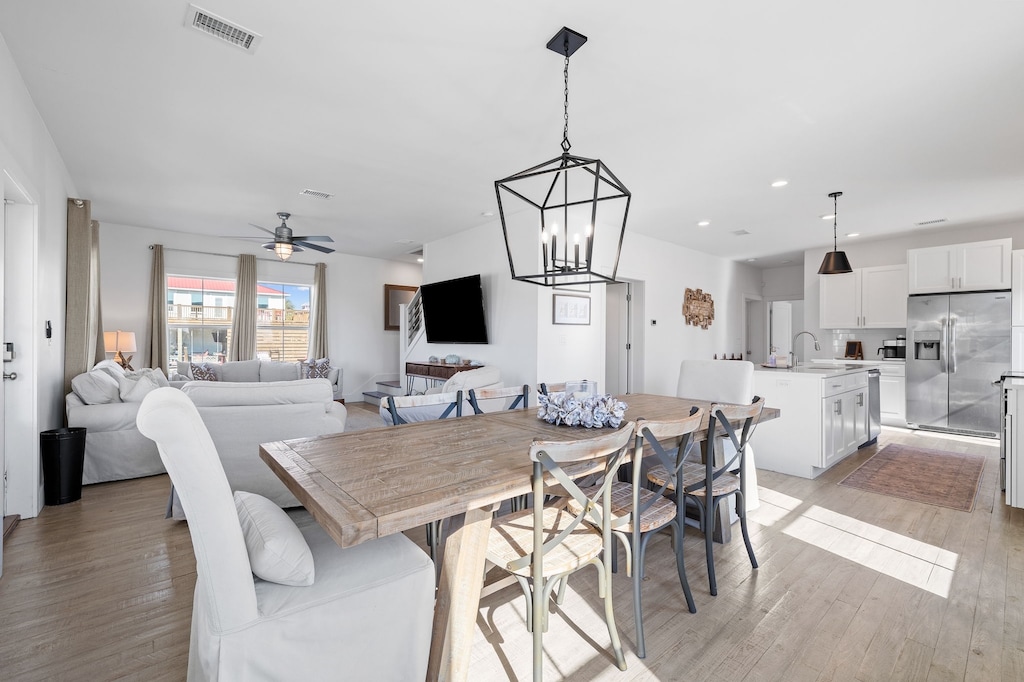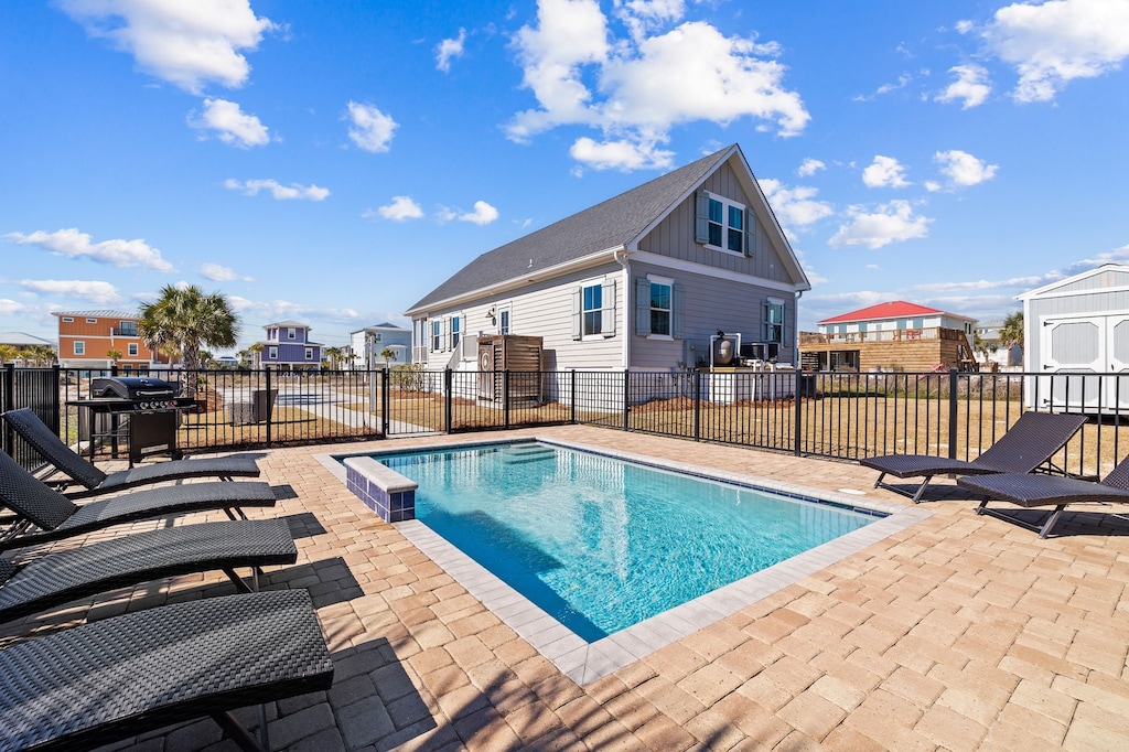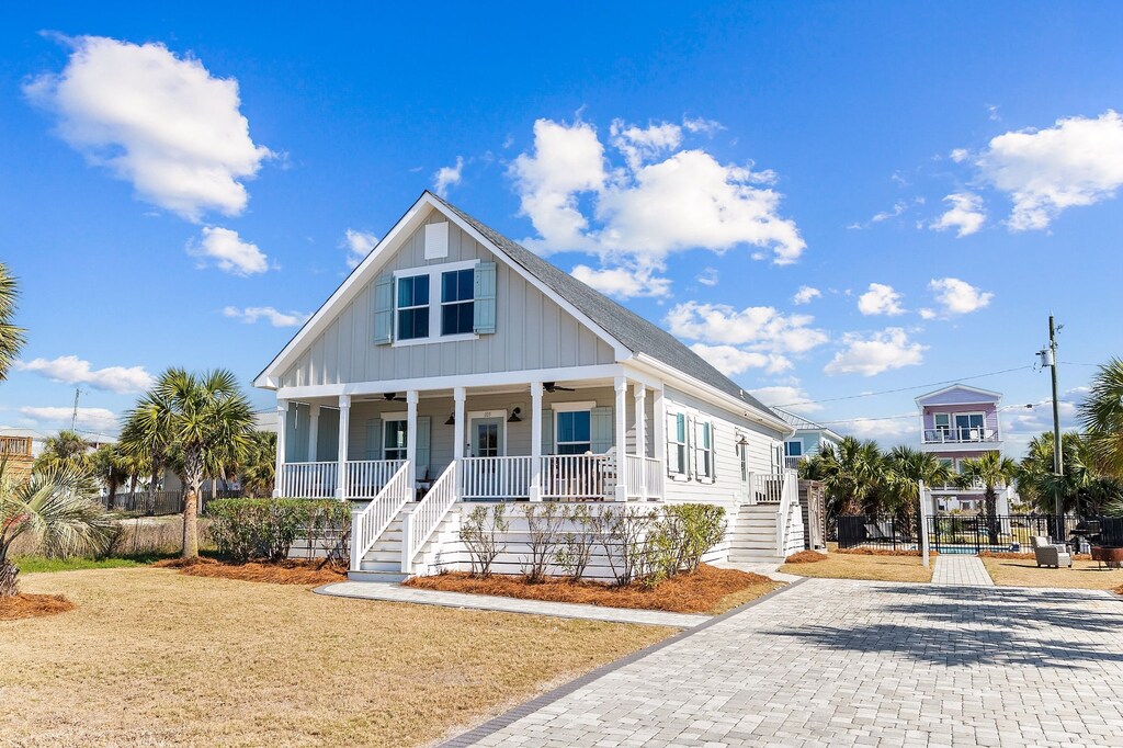 Steeped in charm and tranquility, this cheerful beach bungalow welcomes guests with a spacious front porch boasting soft seating and a charming bistro set, where guests can savor slow mornings sipping coffee. Step inside into the open-concept great room decorated in neutral tones and pale woods. In the living space, sink into the plush slip-covered sofas and armchairs arranged around the 70” Smart TV. A few feet away, the bleached-wood table for 8 awaits delicious meals shared over lively discussions. The kitchen is fully equipped with Frigidaire appliances and an island that doubles as a 4-stool breakfast bar. Adjacent is the laundry room for extended stays. Head outside to find chaise loungers and a propane grill surrounding the sparkling private pool. The outdoor shower makes quick work of sandy feet after a stroll to the beach. As the day winds down, retire to the primary bedroom with a king bed and private bathroom. A guest bedroom with a king bed is also on this level. For convenient entertainment, all the bedrooms have a Smart TV.
