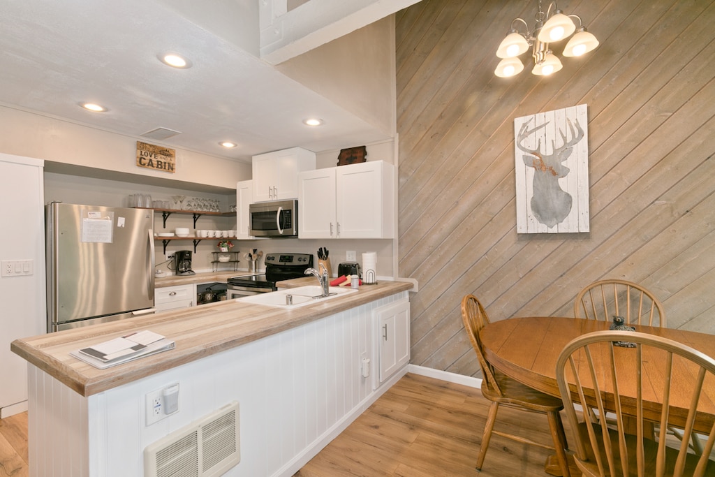 Modern aesthetics mix with mountain charm in this delightful 2-level condo. Large windows and a sliding glass door off the great room fill the first level with natural light and accentuate the vaulted wood ceiling. After a day in the beautiful outdoors, gather in the living area, where a plush L-shaped sofa frames a Smart TV and stacked stone fireplace. In the corner is a built-in desk for quick email check-ins—or set it up as a kid’s coloring station. The well-equipped kitchen offers plenty of counter space for meal prep, as well as high-end appliances. Guests can share meals at the 4-seat table in the dining area, which leads out to a covered deck—start each morning with a peaceful cup of coffee in the fresh air while taking in the wooded views. At bedtime, enjoy a night’s rest in the primary bedroom featuring a California-king bed, a TV, and a private bathroom.