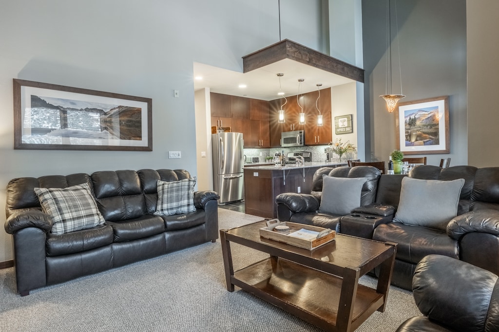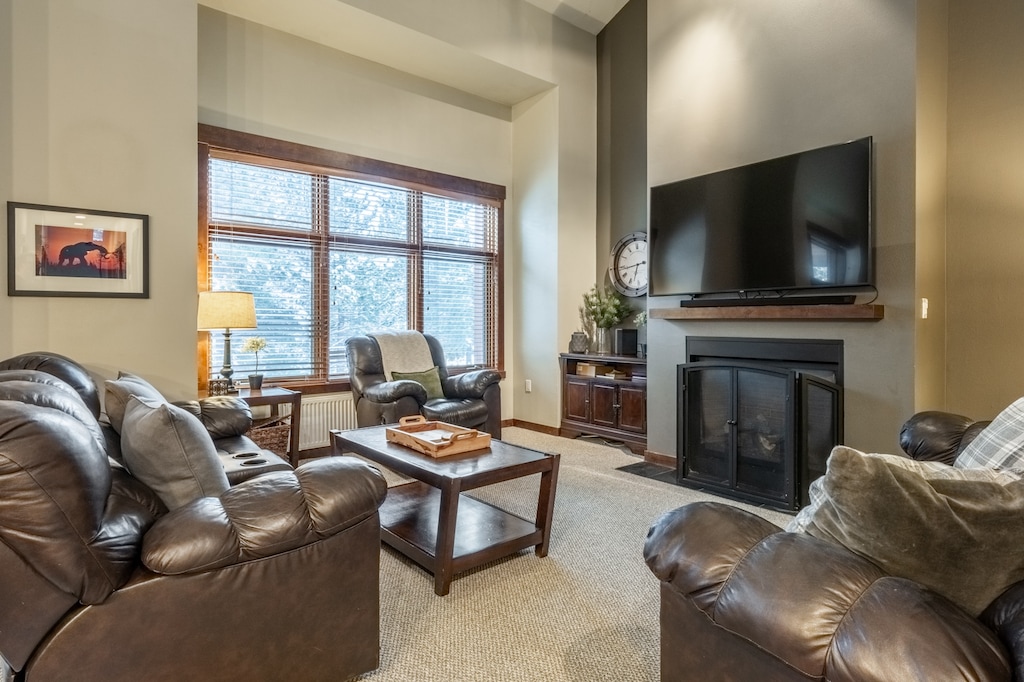 A warm and inviting space, the main-floor great room greets guests with tall, vaulted ceilings, large windows overlooking the golf course, and stunning mountain views in the background. Thoughtfully designed for relaxation and connection, the living area boasts a 65” TV and luxurious leather furnishings, including a plush queen sleeper sofa anchored to a cozy fireplace. The dining area accommodates 6 people with chairs and bench seating. An adjacent balcony with outdoor seating invites guests to enjoy fresh air and peaceful moments. The fully equipped kitchen, featuring high-end GE appliances and ample counter space, ensures effortless meal preparation for every occasion. For added convenience, a stacked washer and dryer are in the hallway closet near the shared bathroom. When it’s time to recharge from a busy day, there are 2 guest bedrooms with TVs to choose from—1 bedroom with 2 full beds and 1 other bedroom with a comfy queen bed.