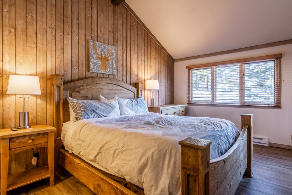 High ceilings, wood-paneled walls, log accents, and a stone fireplace evoke the feeling of a cozy ski lodge inside this 2-level home. The kitchen is fully equipped and designed for social chefs with an open layout and 4-stool breakfast bar. Enjoy meals at the 6-seat table in the dining area, which flows effortlessly into the living space. After a day of adventure, gather together on the soft sectional for a chill movie night on the Smart TV above the fireplace. Out the back door is a balcony stacked with firewood and featuring views of the towering pines. At the evening’s end, guests can enjoy a restful night in the primary bedroom, boasting a king bed, vaulted ceilings, and a private bathroom. The kid-friendly guest bedroom has 2 twin beds.