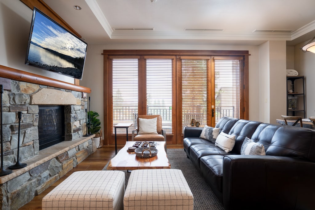 Discover a modern mountain retreat made of gleaming wood accents and a gorgeous fireplace with a rough-hewn stone façade inside this open-concept condo. Guests enter into a tiled entry with a hall tree for storing ski coats and hiking boots. In the living area, floor-to-ceiling windows let in natural light and provide views of the peaceful setting. Settle on the leather sofa and club chair to relax by the gas fireplace or enjoy the Smart TV. For remote work, there’s a charming antique writer’s desk in the corner. The spacious kitchen is fully equipped and boasts granite countertops. Seat up to 6 guests at the hardwood dining table, with 3 stools at the breakfast bar for extra seating or a designated kid’s table! The furnished balcony is an ideal spot for unwinding with a nightcap while taking in the crisp alpine air. When bedtime arrives, retire to the primary bedroom, which hosts a soft king bed, TV, and shared bathroom. Additionally, there is a guest bedroom with a queen bed and a charming bunk room with a twin-over-twin bunk and twin trundle—both feature TVs. A stackable washer and dryer make it easy to keep ski gear toasty and lake clothes dry.