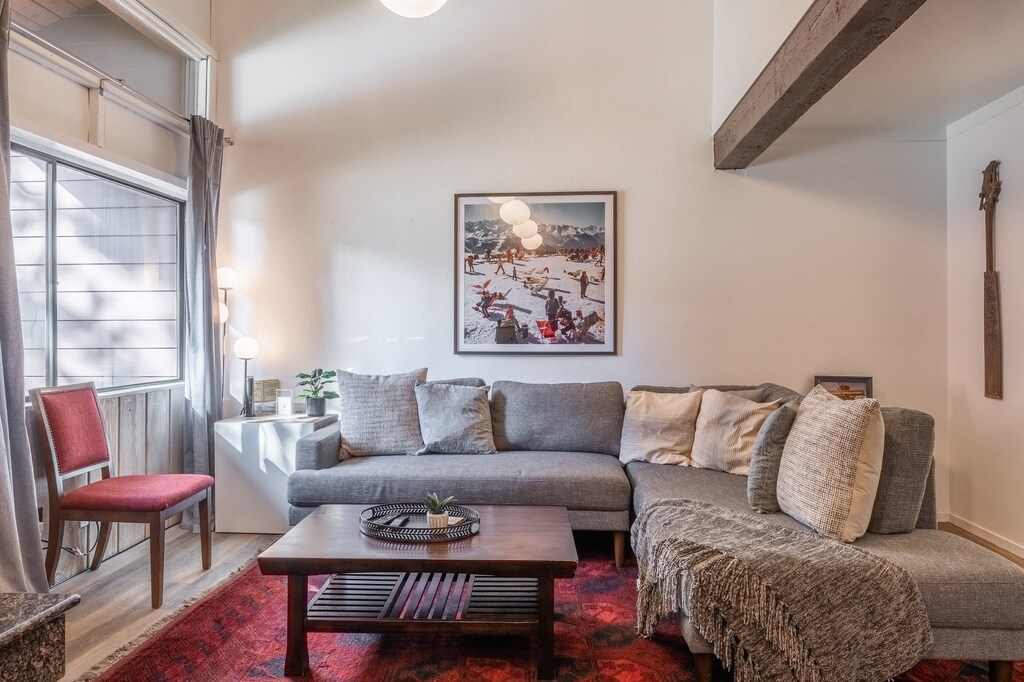 Tall, vaulted ceilings and exposed wood beams add character to the main floor of this modern mountain getaway. The fully equipped kitchen seamlessly flows into the spacious open-concept living and dining areas via a 4-stool breakfast bar. After a day of excitement and exploration, gather for après-ski drinks and tuck into homemade meals at the round 8-person table. A few steps away, sliding glass doors let out to a balcony with a 2-person bistro set and views of the evergreen-dotted landscape. In the living area, a comfortable couch with a chaise sits beside the fireplace and 75” TV, inviting laid-back evenings staying warm by the fire with friends and family. When bedtime arrives, guests can choose between the guest bedroom on this floor with a king bed or head upstairs.