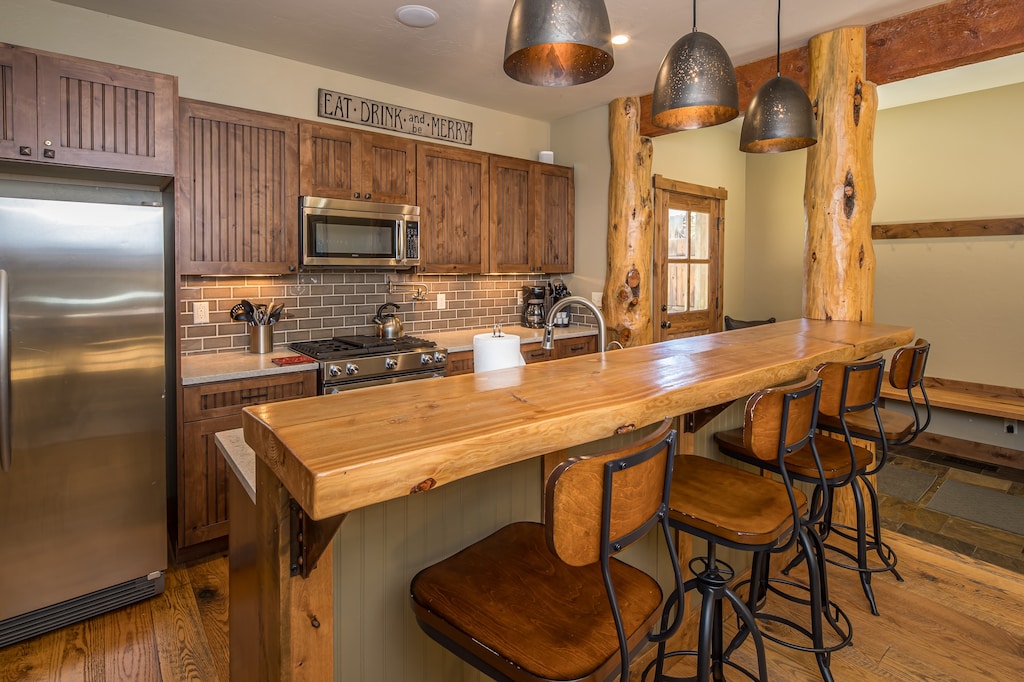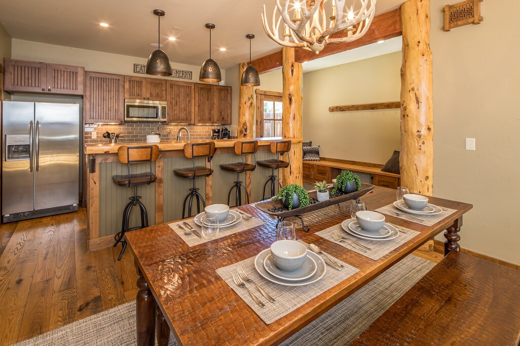 Hewn-timber posts, hardwood floors, and a flagstone fireplace curate a warm and comfortable environment in the first-floor great room of this chic mountain home. By the front door, find hooks and a convenient bench for slipping off outerwear. To the side is a beautiful open-concept kitchen with high-end appliances and a 4-stool breakfast bar for enjoying a morning caffeine boost or an après-ski glass of wine. An 8-person table sits beneath an elegant antler chandelier and divides the kitchen from the living area. Lounge on the sofa and 2 armchairs while watching TV or swapping stories of the day’s adventures. Out the glass doors, discover an enclosed patio, and spend the evening rejuvenating sore muscles in the private hot tub or indulging in a nightcap at the 4-seat table. A bedroom with a queen bed and private bathroom on the first-floor also accesses the patio through your own private entry.