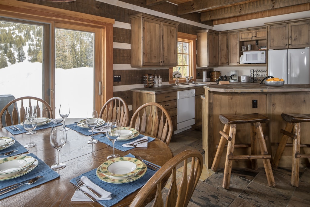 Step inside this 2-story home and instantly feel the warm welcome of its log cabin ambiance, where exposed wood beam ceilings blend natural colors and textures to create an inviting atmosphere. It boasts custom furniture, natural timbers, and tasteful Western décor, offering a spacious sanctuary to gather and unwind after a day of travel. An open floor plan seamlessly connects the living, kitchen, and dining areas, illuminated by abundant natural light through sliding glass doors and picture windows. The living space boasts plush leather furnishings framing a gas fireplace and TV for cozy evenings at home. The fully equipped kitchen provides additional seating with 2 stools at the breakfast bar, while the dining area features a 6-person dining table with beautiful, forested views. The first-floor guest bedroom provides comfort with 2 twin beds, a TV, and private bathroom. There’s also a laundry room for convenience. When in Big Sky, always take advantage of the outdoor spaces—barbecue on the grill and gather around the picnic table, unwind in the private hot tub after a day on the slopes or trails, and watch the sunset from the covered front porch.