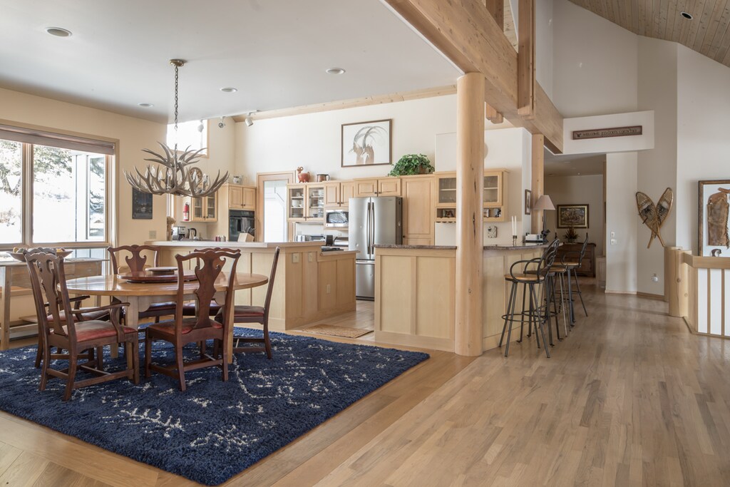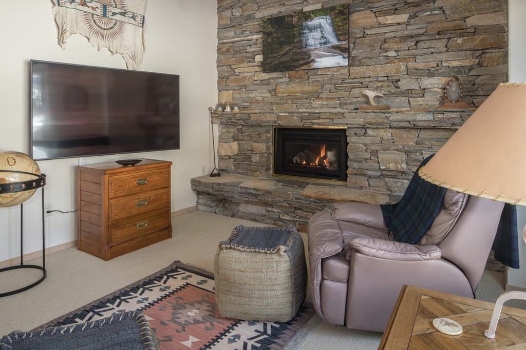 Natural light casts a warm glow across the second-floor great room, featuring Western décor and alpine views. A stone fireplace sits before matching recliners, creating a cozy space to curl up with a book. In the nearby living area, 2 oversized armchairs and a loveseat beckon for laid-back evenings with friends and family. The round dining table seats 6 for formal dinners or a lively card game! The open chef’s kitchen is steps away, with high-end appliances, ample space for whipping up meals and snacks, and a 5-stool breakfast bar along the side. Hooks and a convenient bench between the laundry room and garage provide storage for cold-weather gear. Step onto the deck to find the propane grill and stunning mountain views. After an adventurous day, relax by the gas fireplace in the primary bedroom with a king bed, private bathroom, and access to the deck.