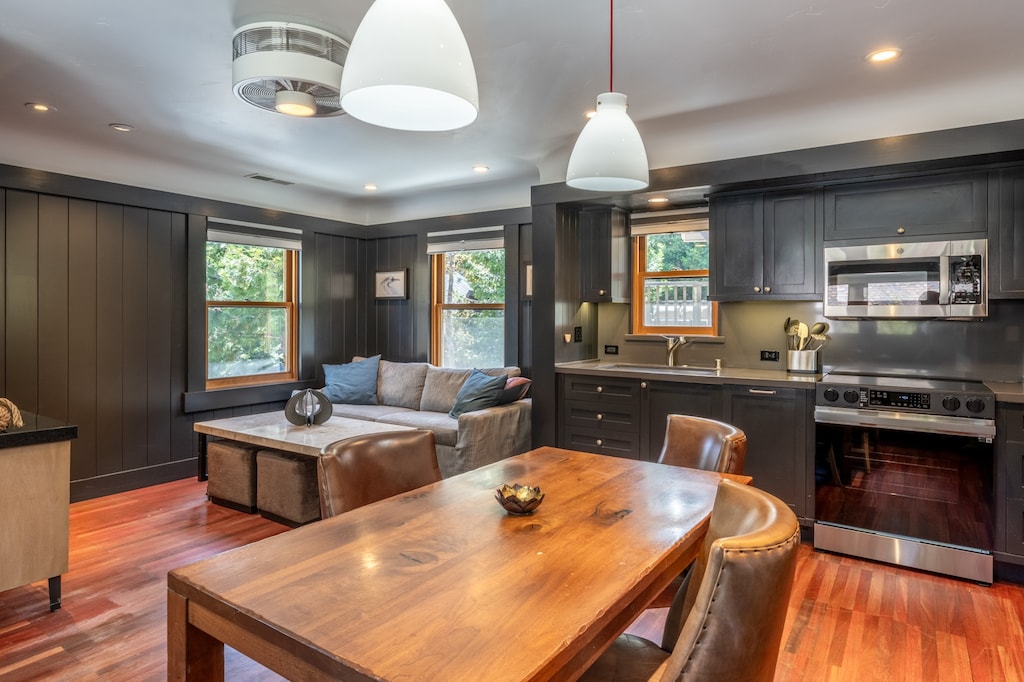 The living, dining, and kitchen spaces are all located on the second level. Warm hardwood floors and richly-painted walls create a cozy atmosphere, accented with tasteful, mountain-inspired décor. In the living area, a soft loveseat, coffee table, and streaming-enabled TV invite guests to relax with a movie or glass of wine. The kitchen is fully equipped and features high-end appliances, so guests have everything they need to craft meals and snacks. A dining table for 4 is a few steps away. Venture onto the front porch, furnished with 2 outdoor chairs, to enjoy the peaceful scenery.