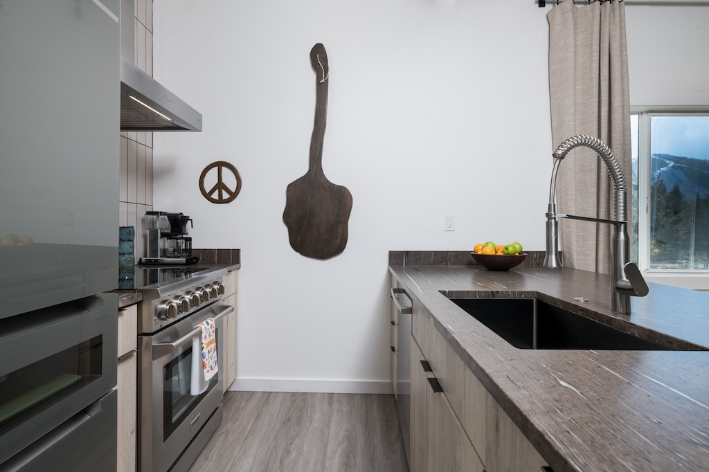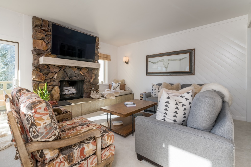 Step inside this recently renovated single-story condo, where a charming foyer greets guests with a convenient bench and hooks for scarves, coats, and hats. Past the entry, a combined living, dining, and kitchen space offers room for visiting and relaxing with the group. When not exploring the delicious local eateries, guests can whip up snacks and meals in the open kitchen, equipped with high-end appliances. Grab a bottle of wine and settle in for a meal at the 4-seat dining table, as the mountain view provides a scenic background. A rustic stone fireplace in the living area sets the mood for cozy nights streaming movies on the 65” Smart TV and lounging on the L-shaped couch and 2 armchairs—or curling up with a book in the window seat by the hearth. On bluebird days and during warmer months, wander out the sliding glass door to find 2 rockers and magnificent views of the mountain peaks. When it’s time to retire, retreat to the primary bedroom or 2 guest bedrooms—all of which feature a king bed, balcony, and private bathroom. For convenience, there is a washer and dryer in the primary bedroom’s bathroom.