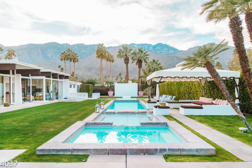 Styled in a chic, holiday regency scheme, the open living area excites the imagination with its globally inspired collection of art and richly colored décor, including a Byzantine blue leather sofa and a canary yellow bistro table. A minimalist dining room, brightened by pink chairs, seats 8 around a unique tree trunk table, while 4 mid-century saucer chairs at the chef’s table provide a casual dining space. The gourmet kitchen’s Sub-Zero refrigerator and Viking stove are complemented by pistachio green cabinetry that adorn the walls. Set against a Baroque stained-glass window is a billiard room with a beautiful mosaic wet bar, ideal for mixing drinks between games. With a quartet of sumptuously appointed bedrooms, each adorned with Frette linens and sliding glass doors leading to the backyard sanctuary, Villa Sierra provides endless luxury. Its 75-foot swimming pool captivates guests—boasting an attached sitting spa and Bisazza in-laid tanning shelf—with a small walkover that leads to the 10-person art deco cabana, ensuring loved ones never want to leave this peaceful oasis. A lush, green Ficus wall surrounds the manicured grounds for total privacy while sipping cocktails at the outdoor bars and grill nooks, lazing in the poolside loungers, or dining alfresco under the clear blue skies. When night falls on the valley, an outdoor firepit is sure to please with the remarkable silhouetted mountain backdrop.