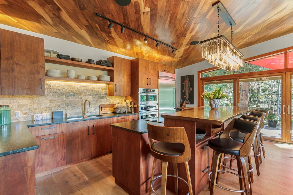 Modern finishes blend effortlessly with luxury alpine style in this striking 2-story mountain retreat. An inviting entryway with a bench, an alcove for coats, and a convenient laundry room welcomes guests. An accent ceiling with warm wood tones, coupled with expansive windows, flawlessly captures the essence of the majestic mountain and forest views surrounding the great room. Snuggle up on the oversized leather sectional facing the 65" Smart TV with Sonos speakers for a chill movie night in front of the flickering gas fireplace. Mix drinks at the wet bar equipped with a wine chiller and beverage fridge for easy entertainment. The sleek, modern kitchen boasts stunning wood cabinetry, spacious granite countertops, high-end appliances, and a multi-level kitchen island/breakfast bar that seats 6 for casual dining. With multiple ways to access the outside deck from the great room, it’s easy to dine alfresco on the picnic table, barbecue on the gas grill, and relax in the loungers and rocking chairs—a heat lamp keeps guests warm on cool days. When evening falls, roast marshmallows around the backyard firepit. Retire to 2 comfortable bedrooms on this floor, both with king beds—1 primary bedroom with a private bathroom and 1 guest bedroom with a custom painting on the wall and access to the back deck.