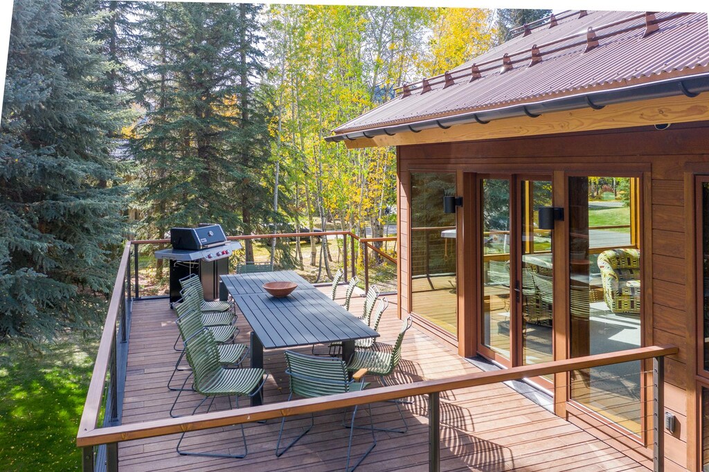 Discover the main living space and kitchen on the top floor, where soaring windows facing Bald Mountain stretch up to a vaulted ceiling and wood paneling adds refined mountain charm. Curl up on the funky purple sectional and 2 accent chairs for a relaxed evening around the wood-burning fireplace. The formal dining table seats 8, while the quaint nook area has bench seating and 2 chairs for coffee, puzzles or poker. The stylish kitchen offers high-end appliances and a 4-stool bar for sharing a bottle of wine as dinner simmers. Tucked by the window are 2 club chairs for cozy conversation and a glass door out to the large deck. The spacious primary bedroom offers deluxe accommodations with a king bed and en-suite bathroom.
