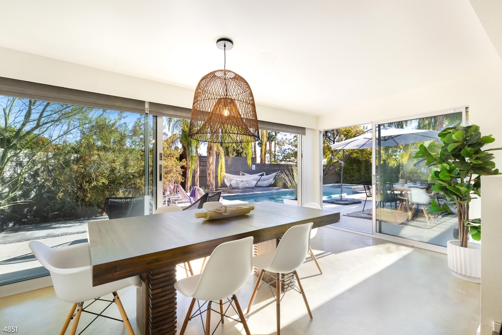 When you aren’t exploring restaurants downtown, enjoy home-cooked meals around sunken dining room, which overlooks the pool area. Or sit at the 4 seats at the kitchen counter. Glass doors open the living area to the outdoors, where a six-seat poolside table offers an option for al fresco dining.
