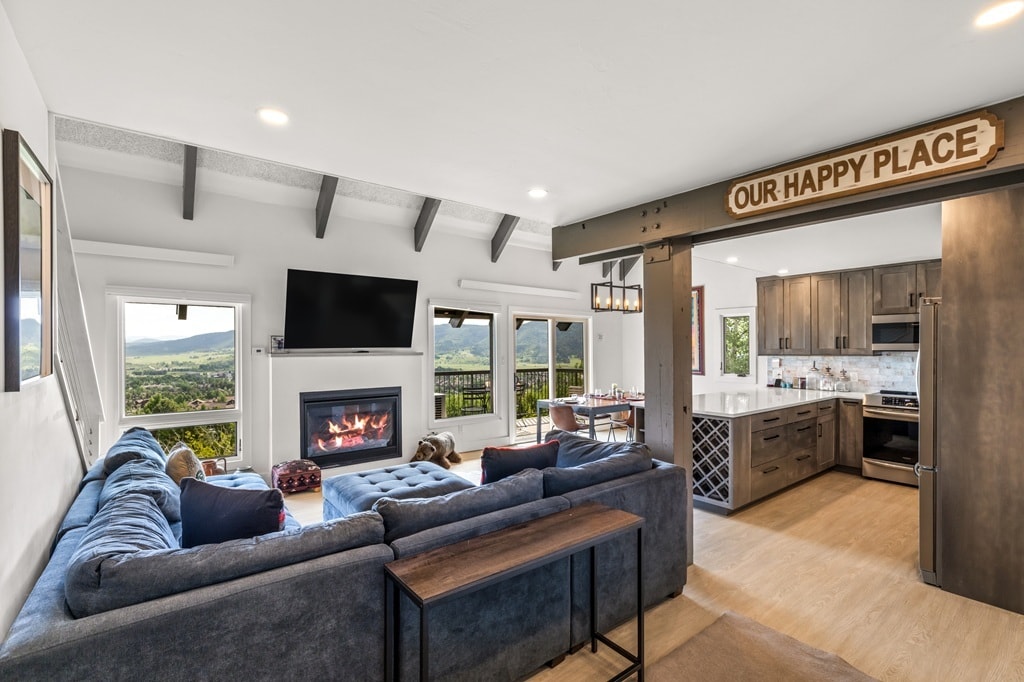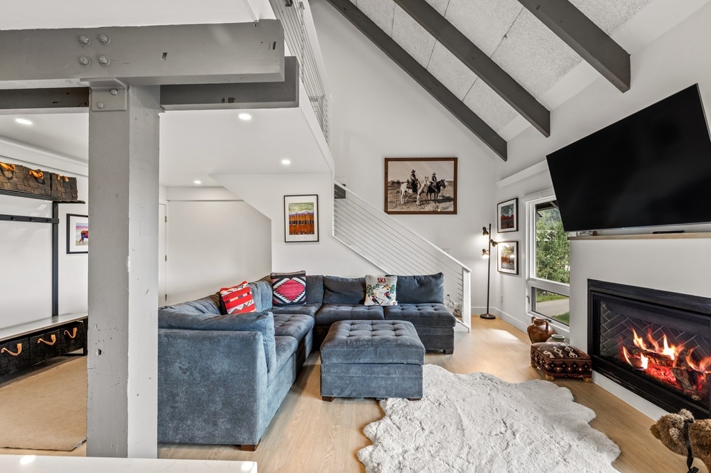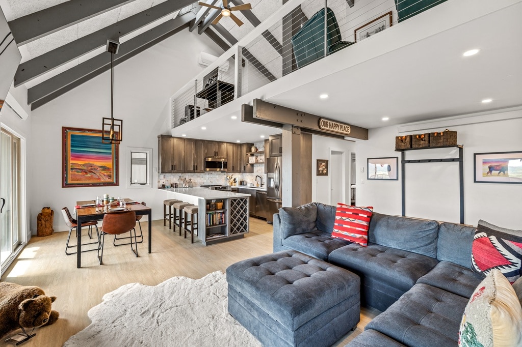 Step inside to a spacious open-concept living area featuring a plush sectional sofa, cozy seating, and large windows that flood the room with natural light. Warm finishes, tasteful mountain décor, and a welcoming gas fireplace create the perfect après-ski vibe. The generous living space flows seamlessly into the dining area and fully equipped kitchen, stocked with modern appliances, plenty of counter space, and all the essentials you need to prepare hearty meals.