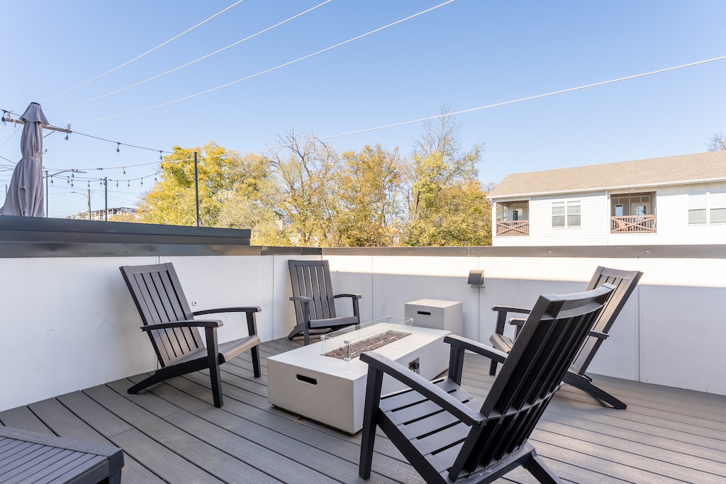Inside, you’ll find three spacious bedrooms, each with their own private bathroom for the ultimate comfort and privacy. Two feature plush king beds, while the third offers a cozy queen—perfect for families, couples, or groups traveling together. The chic design aesthetic adds warmth and personality throughout the home. The open-concept main floor invites connection, with a sleek chef’s kitchen featuring high-end appliances and a large island that flows seamlessly into the dining and living areas. It’s the perfect setup for cooking, entertaining, or unwinding after a day in the city. Head up to the third level to enjoy a beautiful bonus space and step outside to your private deck for a relaxed evening under the Nashville sky. Fire up the grill, share a meal, or simply take in the view with a glass of wine in hand.