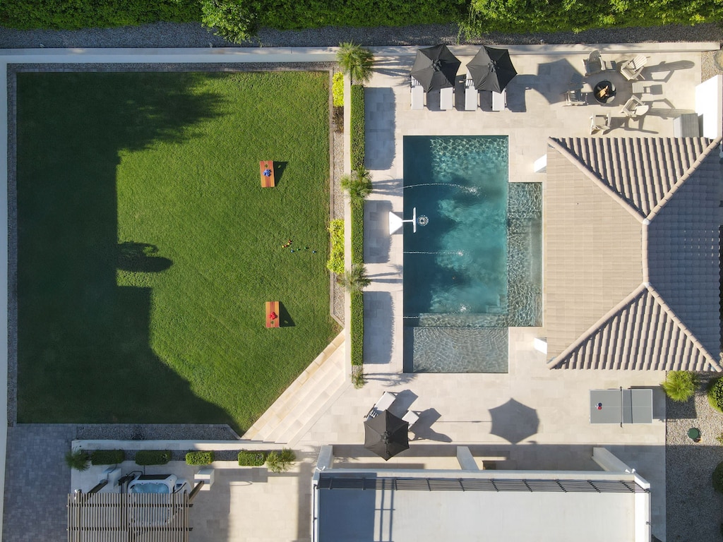 Huge, gorgeous backyard with several outdoor living areas, a heated pool with rainfall water feature, an unbelievable outdoor kitchen, TV, firepit, hot tub and covered outdoor dining. (Pool & Spa heat is included at no additional charge)