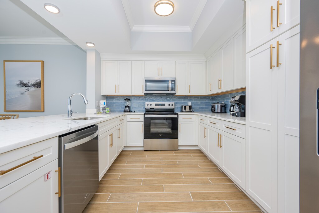 The modern kitchen features white cabinetry, stainless steel appliances, an inset sink, and both a Keurig and traditional coffee maker. A separate wet bar with its own sink and ice maker makes entertaining easy.