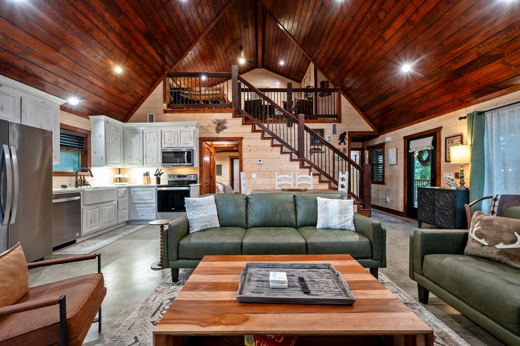 Inside, you’ll find modern comforts and rustic touches, from the soaring stone fireplace and Smart TVs in every room, to the fully equipped kitchen with a spacious island and a custom coffee bar for your morning brew. Each bedroom has its own full bathroom, plus there’s an extra half bath for convenience.