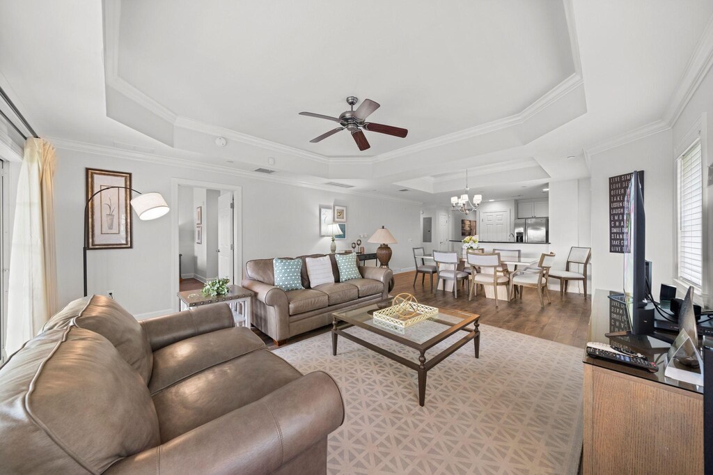 From the moment you step inside, you’ll feel the warmth and calm that define this property. The living area is thoughtfully designed to create an open, airy atmosphere, inviting you to relax after a day of exploring Orlando’s world-renowned attractions or playing a round on one of Reunion’s championship golf courses. Large sliding glass doors fill the space with natural light and lead directly to the private patio overlooking the golf course, creating a seamless blend between indoor comfort and outdoor enjoyment.