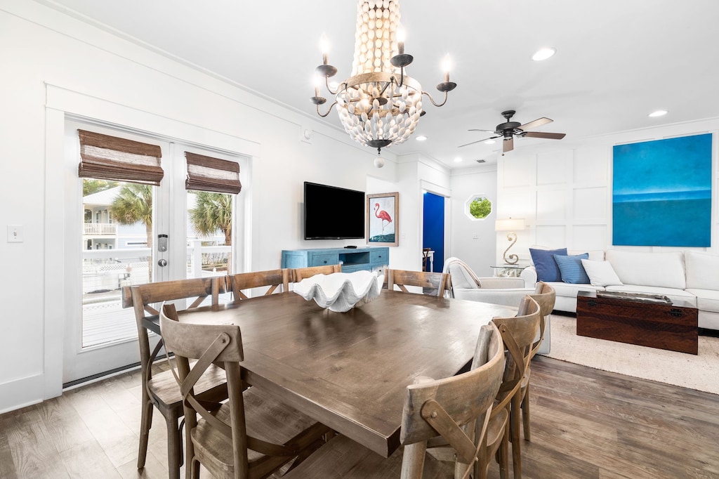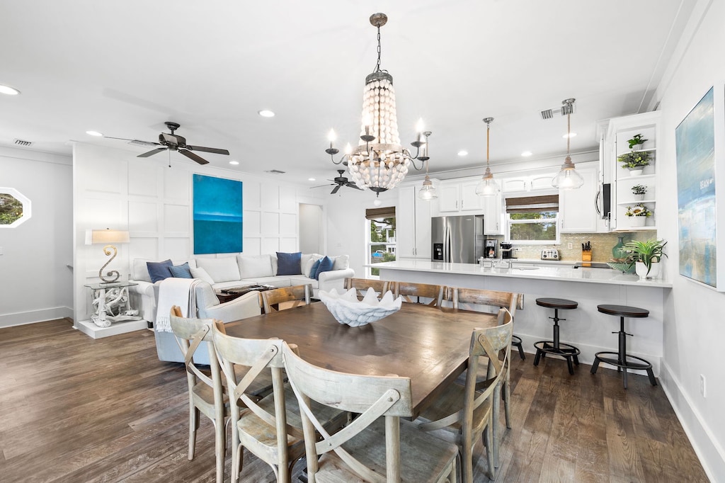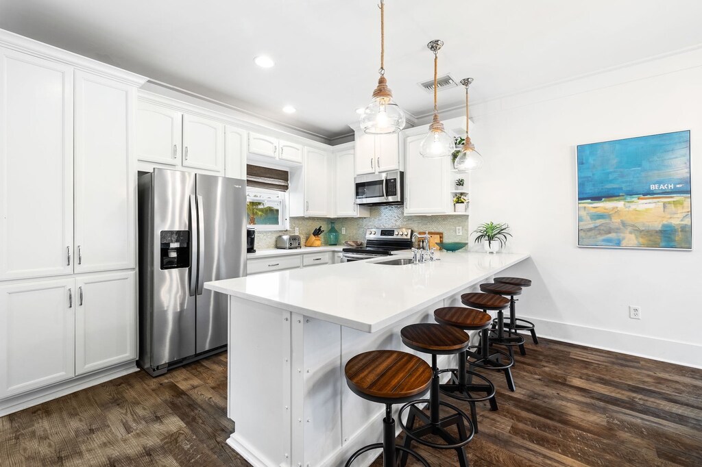 The spacious second floor is the primary gathering space of this home, where an open great room combines the kitchen, dining, and main living areas with wood floors and natural lighting. The living area features a plush, white linen sofa and a matching armchair for added comfort. The adjacent dining area offers seating for 8 with a seashell chandelier overhead and direct access to the second-floor furnished deck with gorgeous Gulf views. The well-equipped kitchen features a pantry, quartz countertops, and a kitchen island doubling as a 6-stool breakfast bar. Perfect for entertaining!