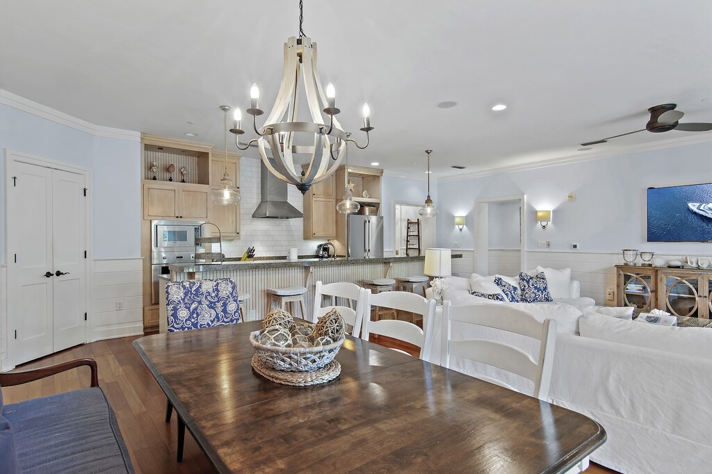 An airy and timeless atmosphere welcomes guests inside this single-story condo. Shiplap wainscotting and honey hardwood floors tie together the combined living, dining, and kitchen areas, decorated in a mix of soft blue and breezy white textiles. The living area’s 2 slip-covered couches, armchairs, and 65” Smart TV beckons guests to kick back and relax after a day of exploring. The thoughtfully designed kitchen features high-end Bosch and Viking appliances, ample counter space for meal prep, and a vast 6-person breakfast bar for entertaining. Savor sunlit morning brunches and relaxed evening meals at the charming dining table with 5 chairs and a cozy 3-person bench. Along the back wall, 2 sliding glass doors fill the space with natural light and lead out to a spacious balcony. Meander outside to dine alfresco at the table for 6 or sip a morning cup of coffee on the cushioned chairs. At evening’s end, retire for a restful evening in the primary bedroom with a king bed, private bathroom, and balcony access. There are 2 guest bedrooms—the first has a queen bed and a private bathroom, while the second has a full-over-full bed and a twin trundle. A convenient laundry room helps keep swimwear and beach towels fresh for tomorrow’s fun!